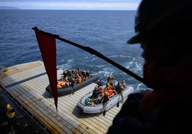 NASA astronauts Deniz Burnham, Andre Douglas, and ESA (European Space Agency) astronaut Luca Parmitano, get in boats that will take them to the Crew Module Test Article (CMTA) during Underway Recovery Test-12 onboard USS Somerset off the coast of California, Thursday, March 27, 2025. During the test, NASA and Department of Defense teams are practicing to ensure recovery procedures are validated as NASA plans to send Artemis II astronauts around the Moon and splashdown in the Pacific Ocean. Photo Credit: (NASA/Bill Ingalls)