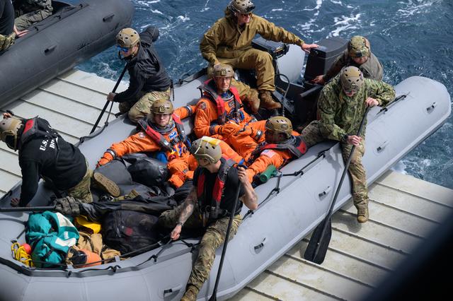 NASA astronauts Deniz Burnham, Andre Douglas, and ESA (European Space Agency) astronaut Luca Parmitano, get in boats that will take them to the Crew Module Test Article (CMTA) during Underway Recovery Test-12 onboard USS Somerset off the coast of California, Thursday, March 27, 2025. During the test, NASA and Department of Defense teams are practicing to ensure recovery procedures are validated as NASA plans to send Artemis II astronauts around the Moon and splashdown in the Pacific Ocean. Photo Credit: (NASA/Bill Ingalls)
