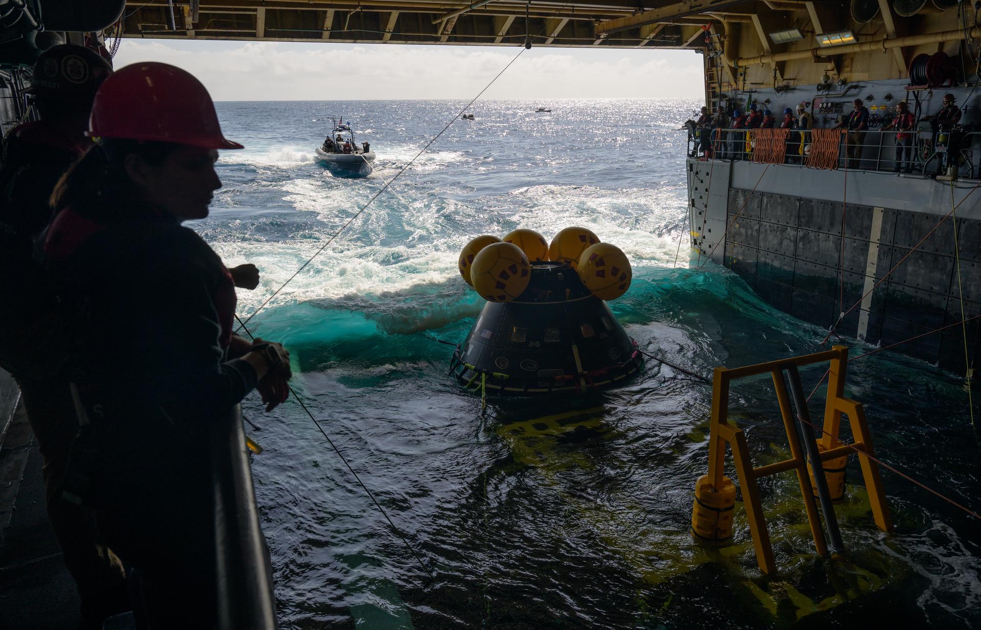 The Crew Module Test Article (CMTA), a full scale mockup of the Orion spacecraft, is seen during Underway Recovery Test-12 onboard USS Somerset off the coast of California, Friday, March 28, 2025. During the test, NASA and Department of Defense teams are practicing to ensure recovery procedures are validated as NASA plans to send Artemis II astronauts around the Moon and splashdown in the Pacific Ocean. Photo Credit: (NASA/Bill Ingalls)