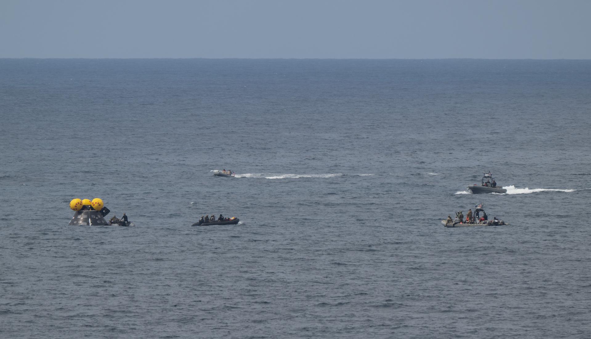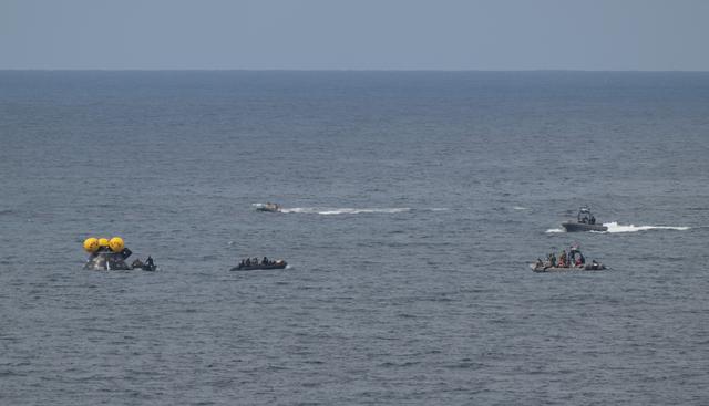 Teams work around the Crew Module Test Article (CMTA) as they practice Artemis recovery operations during Underway Recovery Test-12 onboard USS Somerset off the coast of California, Friday, March 28, 2025. During the test, NASA and Department of Defense teams are practicing to ensure recovery procedures are validated as NASA plans to send the Artemis II astronauts around the Moon and splashdown in the Pacific Ocean. Photo Credit: (NASA/Joel Kowsky)