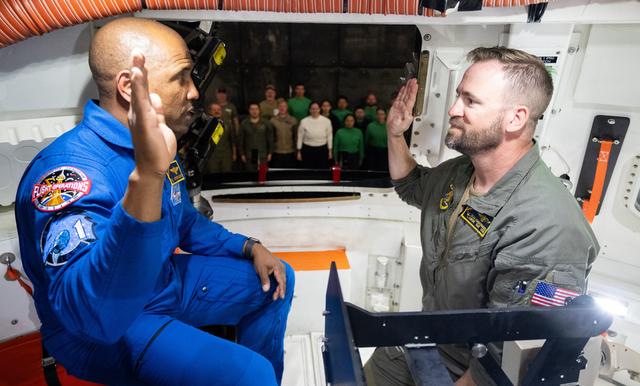 NASA astronaut U.S. Navy Capt. Victor Glover provides the oath of re-enlistment to Chief Naval Aircrewman Helicopter Sean Sondergaard in the Crew Module Test Article (CMTA) during Underway Recovery Test-12 onboard USS Somerset off the coast of California, Saturday, March 29, 2025. During the test, NASA and Department of Defense teams are practicing to ensure recovery procedures are validated as NASA plans to send the Artemis II astronauts around the Moon and splashdown in the Pacific Ocean. Photo Credit: (NASA/Joel Kowsky)
