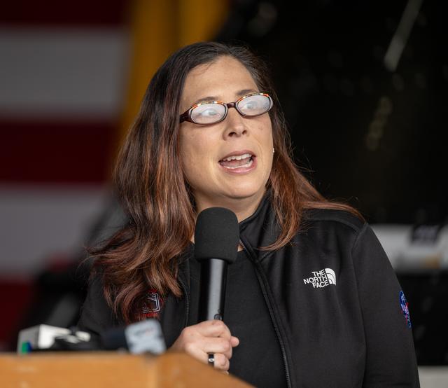 Liliana Villarreal, NASA’s Artemis II landing and recovery director, Exploration Ground Systems Program, gives remarks during a media event where NASA and the Department of Defense discussed the recovery operations that will bring the Artemis II astronauts and the agency’s Orion spacecraft home at the conclusion of next year’s mission around the Moon, Monday, March 31, 2025, onboard USS Somerset at Naval Base San Diego, in California. The teams spent the week practicing the procedures they will use to recover the astronauts after their more than 600,000 mile journey from Earth to the Moon and back on the first crewed mission under the Artemis campaign. Photo Credit: (NASA/Bill Ingalls)