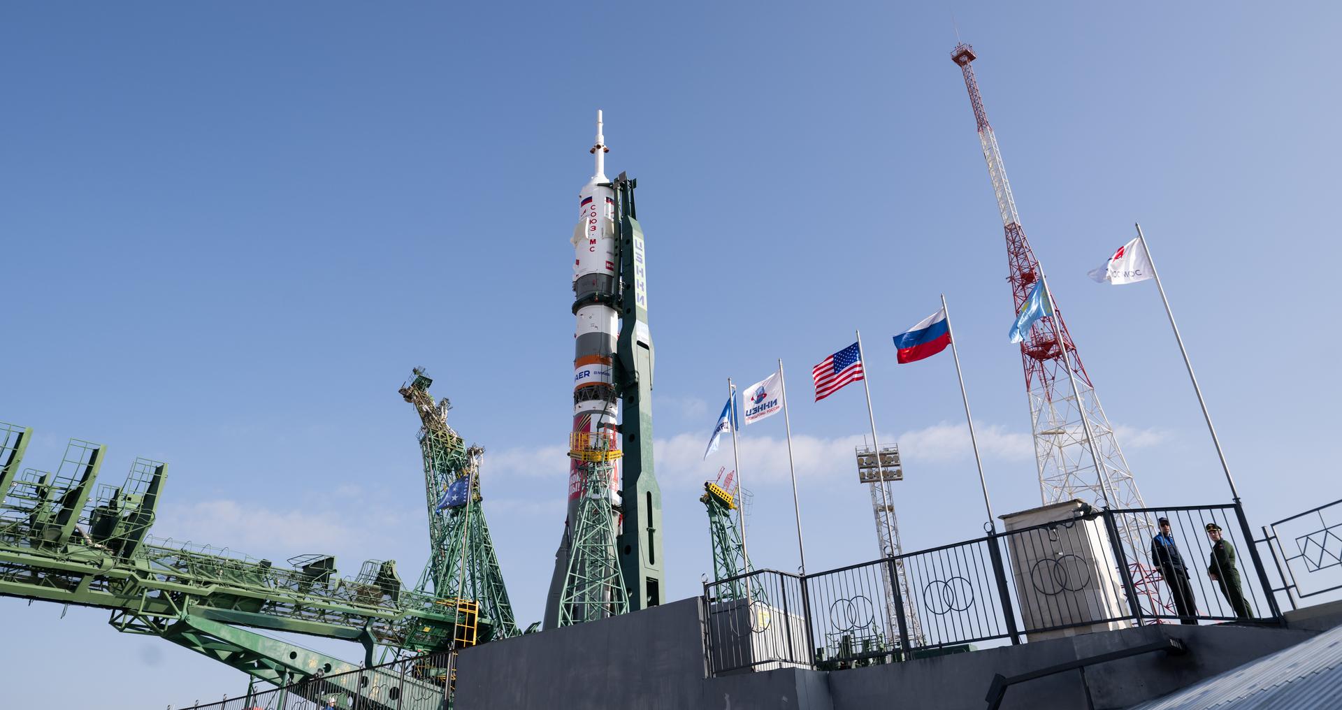 The Soyuz rocket is seen at the launch pad at Site 31 after being rolled out by train, Saturday, April 5, 2025, at the Baikonur Cosmodrome in Kazakhstan. Expedition 73 crewmembers: NASA astronaut Jonny Kim, and Roscosmos cosmonauts Sergey Ryzhikov and Alexey Zubritskiy, are scheduled to launch aboard their Soyuz MS-27 spacecraft on April 8. Photo Credit: (NASA/Joel Kowsky)