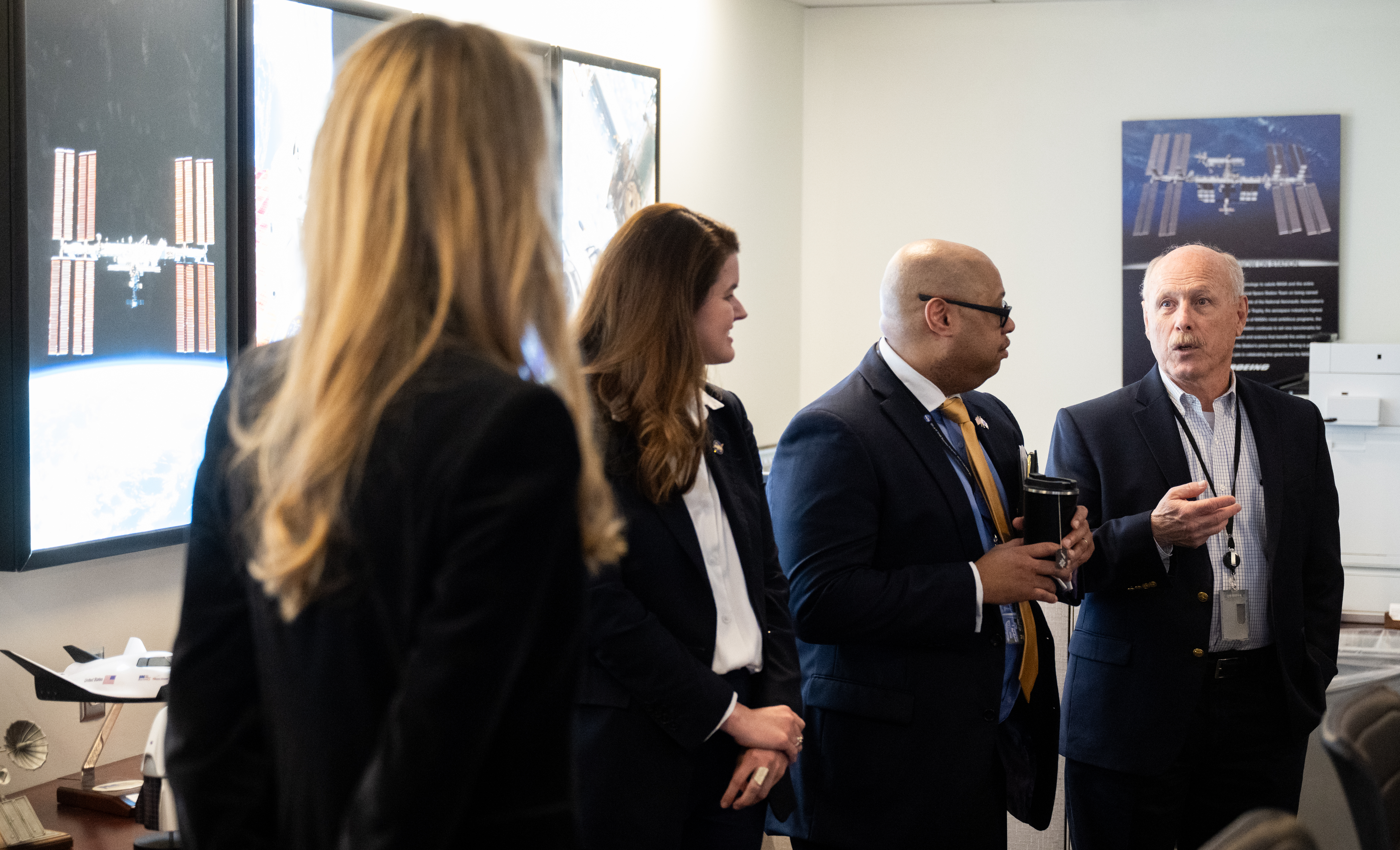 Ken Bowersox, associate administrator for NASA’s Space Operations Mission Directorate, right, is seen alongside Dwight Deneal, assistant administrator for NASA’s Office of Small Business Programs, second from right, and Casey Swails, NASA deputy associate administrator, as he speaks with Administrator of the Small Business Administration Kelly Loeffler during a visit to the Space Operations Center, Wednesday, April 16, 2025, at the Mary W. Jackson NASA Headquarters building in Washington. Photo Credit: (NASA/Joel Kowsky)