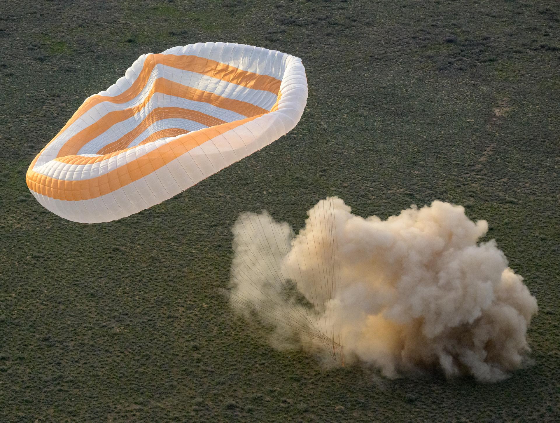 The Soyuz MS-26 spacecraft is seen as it lands in a remote area near the town of Zhezkazgan, Kazakhstan with Expedition 72 NASA astronaut Don Pettit, and Roscosmos cosmonauts Alexey Ovchinin and Ivan Vagner aboard, Sunday, April 20, 2025, (April 19 Eastern). The trio are returning to Earth after logging 220 days in space as a members of Expeditions 71 and 72 aboard the International Space Station. Photo Credit: (NASA/Bill Ingalls)