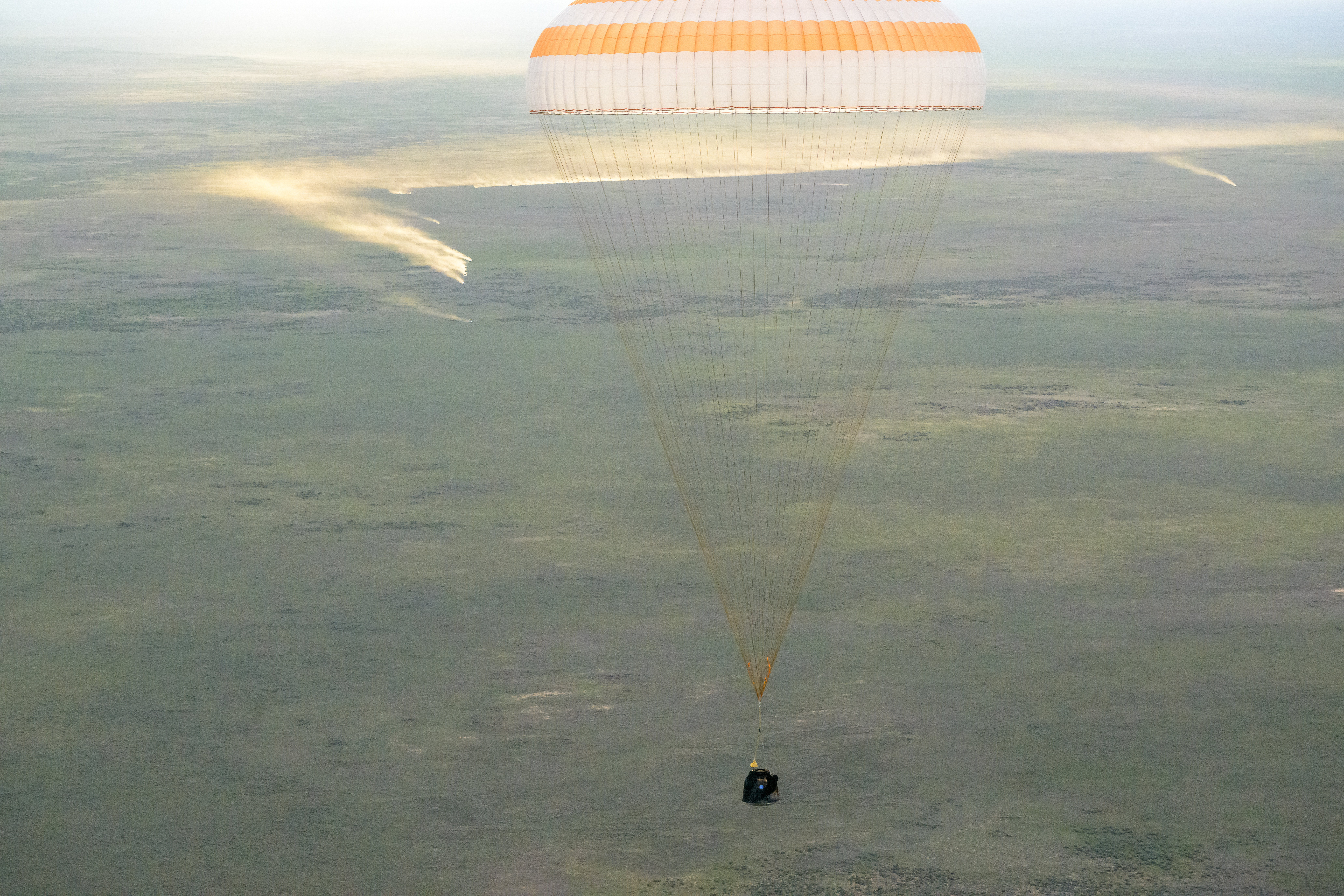 The Soyuz MS-26 spacecraft is seen as it lands in a remote area near the town of Zhezkazgan, Kazakhstan with Expedition 72 NASA astronaut Don Pettit, and Roscosmos cosmonauts Alexey Ovchinin and Ivan Vagner aboard, Sunday, April 20, 2025, (April 19 Eastern). The trio are returning to Earth after logging 220 days in space as members of Expeditions 71 and 72 aboard the International Space Station. Photo Credit: (NASA/Bill Ingalls)
