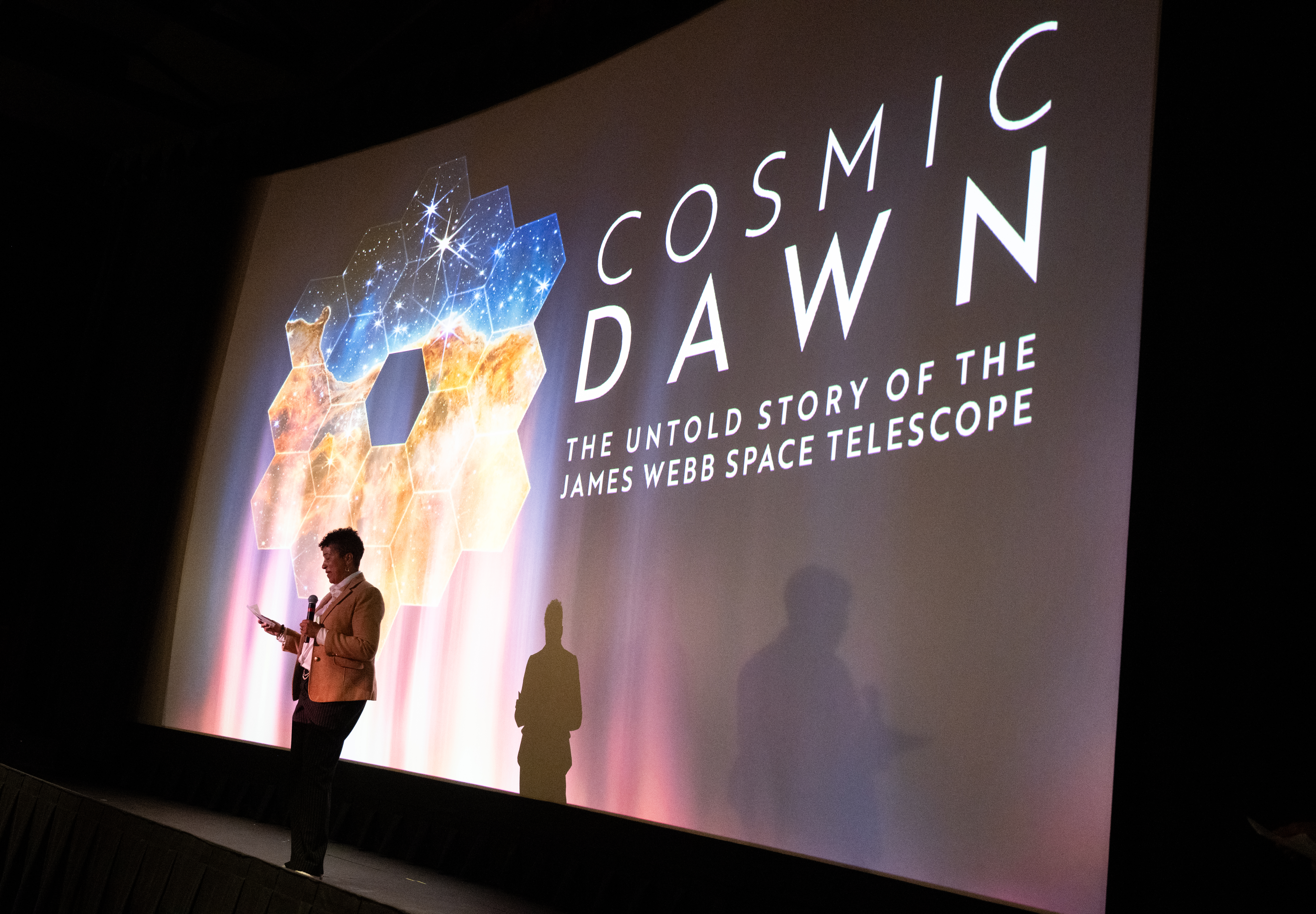 Cynthia Simmons, deputy director of NASA’s Goddard Space Flight Center, speaks before a screening of the new NASA+ documentary “Cosmic Dawn: The Untold Story of the James Webb Space Telescope,” Wednesday, June 11, 2025, at the Greenbelt Cinema in Greenbelt, Maryland. Featuring never-before-seen footage, Cosmic Dawn offers an unprecedented glimpse into the assembly, testing, and launch of NASA’s James Webb Space Telescope. Photo Credit: (NASA/Joel Kowsky)