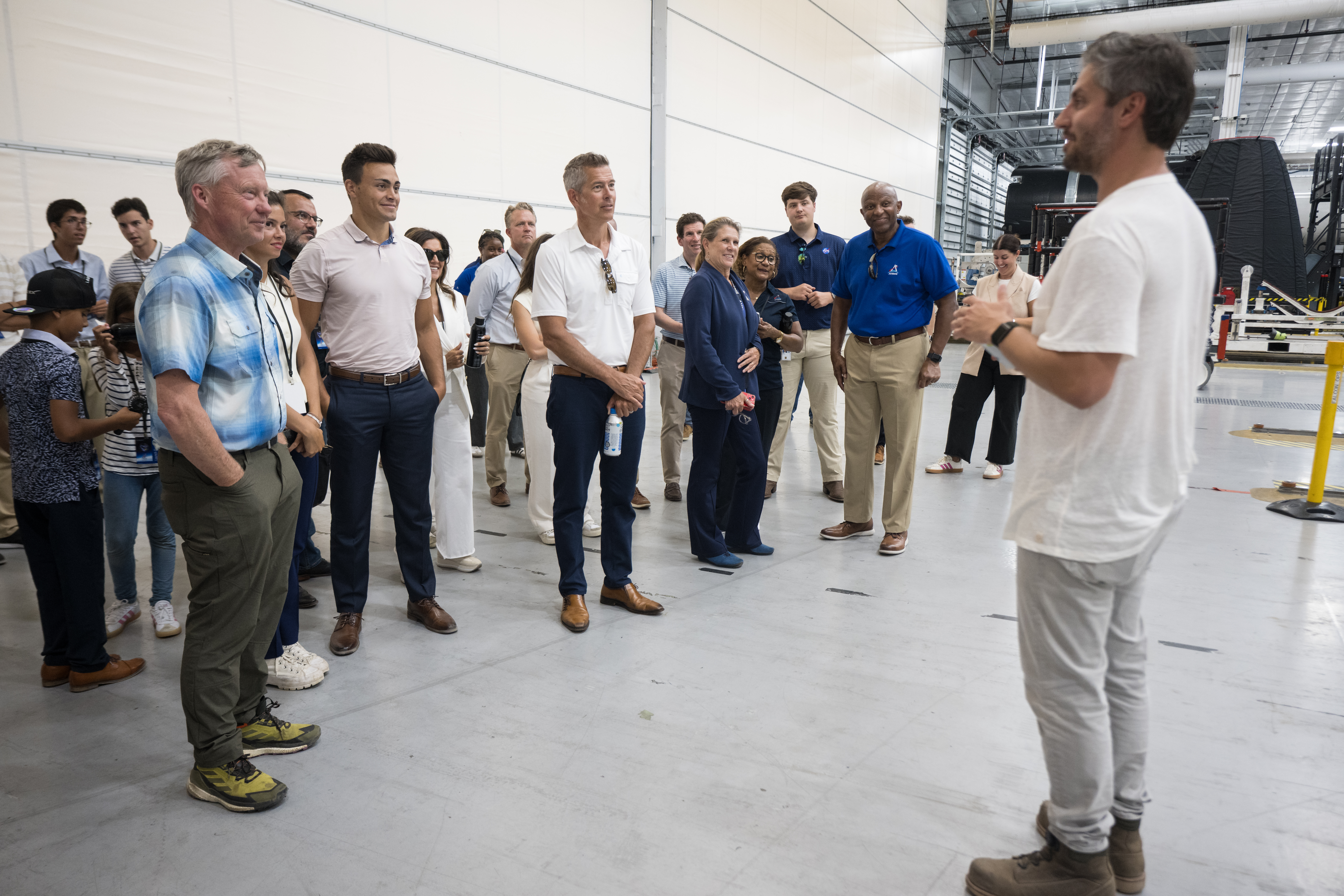 SpaceX Vice President for Launch, Kiko Dontchev, provides remarks during a tour of Hangar X with Acting NASA Administrator Sean Duffy, his family, and NASA leadership, Wednesday, July 30, 2025, at NASA’s Kennedy Space Center in Florida. Photo Credit: (NASA/Aubrey Gemignani)