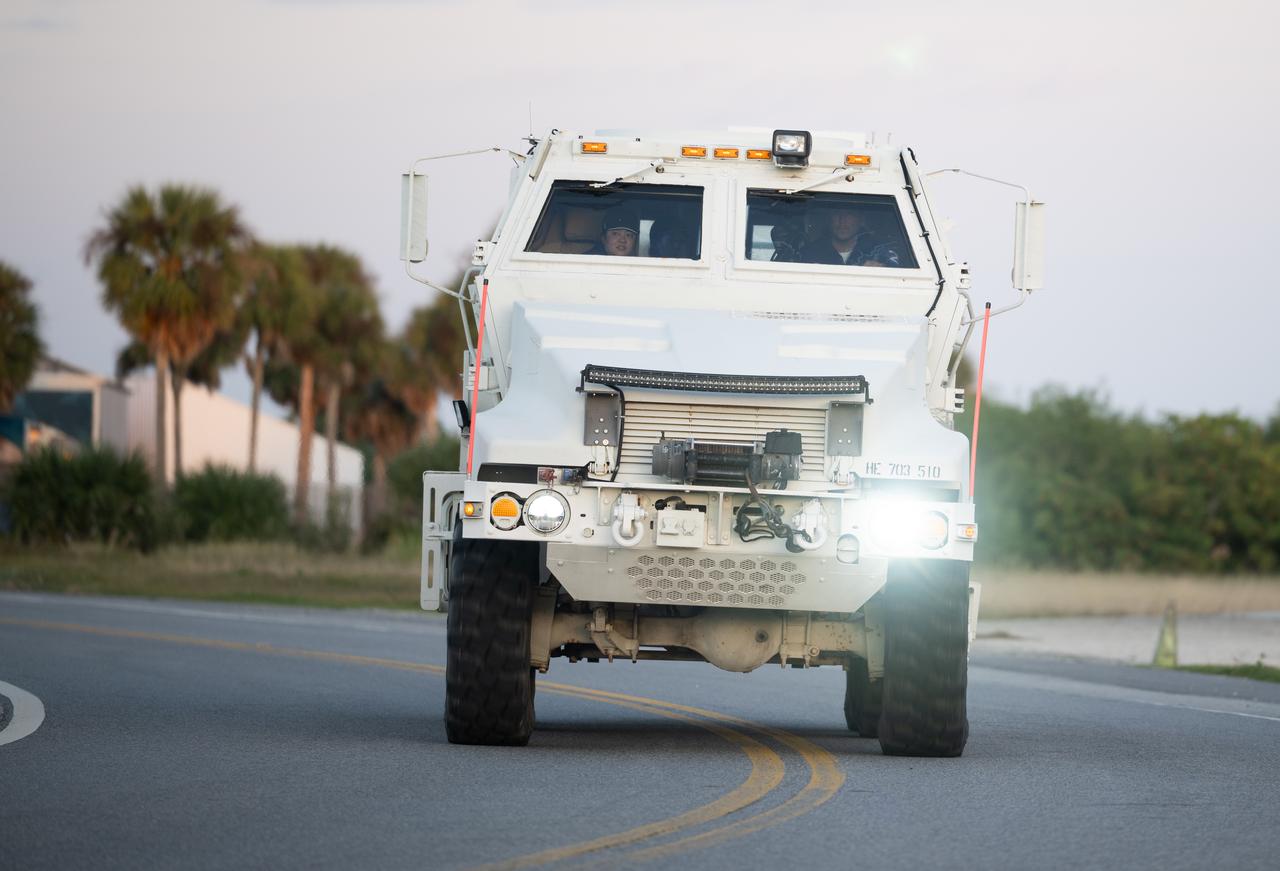 Teams at NASA's Kennedy Space Center in Florida practiced various emergency rescue training scenarios with the Artemis II crew, Friday, Dec. 19, 2025, ahead of the Artemis II mission. In the unlikely event of an emergency during launch countdown at Launch Complex 39B, personnel will be transported in mine-resistant ambush protected vehicles, or MRAPS, from the pad and to one of the triage site locations at Kennedy. Photo Credit: (NASA/Joel Kowsky)