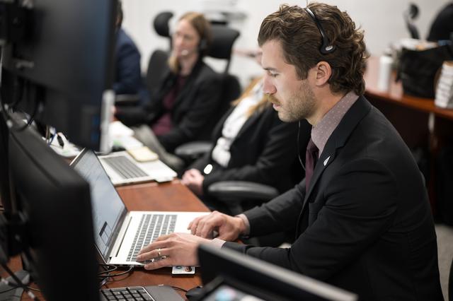 Teams monitor the progress of a Countdown Demonstration Test with Artemis II crewmembers NASA astronauts Reid Wiseman, commander; Victor Glover, pilot; Christina Koch, mission specialist; and CSA (Canadian Space Agency) astronaut Jeremy Hansen, mission specialist onboard their Orion spacecraft from Firing Room 2 of the Rocco A. Petrone Launch Control Center, Saturday, Dec. 20, 2025, at NASA’s Kennedy Space Center in Florida. For this operation, the Artemis II crew and launch teams are simulating the launch day timeline including suit-up, walkout, and spacecraft ingress and egress. Through the Artemis campaign, NASA will send astronauts to explore the Moon for scientific discovery, economic benefits, and to build the foundation for the first crewed missions to Mars, for the benefit of all. Photo Credit: (NASA/Aubrey Gemignani)