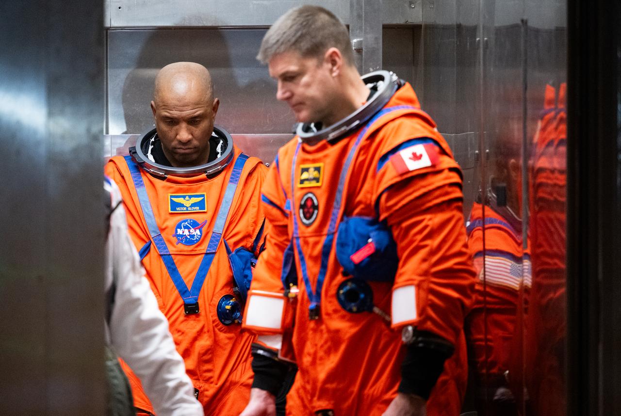 Artemis II crewmember NASA astronaut Victor Glover, pilot; left, and CSA (Canadian Space Agency) astronaut Jeremy Hansen, mission specialist; are seen in the elevator as they arrives with fellow crewmates NASA astronauts Reid Wiseman, commander; and Christina Koch, mission specialist; at the 275-foot level of the mobile launcher as they prepare to board their Orion spacecraft atop NASA’s Space Launch System rocket during the Artemis II countdown demonstration test, Saturday, Dec. 20, 2025, inside the Vehicle Assembly Building at NASA’s Kennedy Space Center in Florida. For this operation, the Artemis II crew and launch teams are simulating the launch day timeline including suit-up, walkout, and spacecraft ingress and egress. Through the Artemis campaign, NASA will send astronauts to explore the Moon for scientific discovery, economic benefits, and to build the foundation for the first crewed missions to Mars, for the benefit of all. Photo Credit: (NASA/Joel Kowsky)