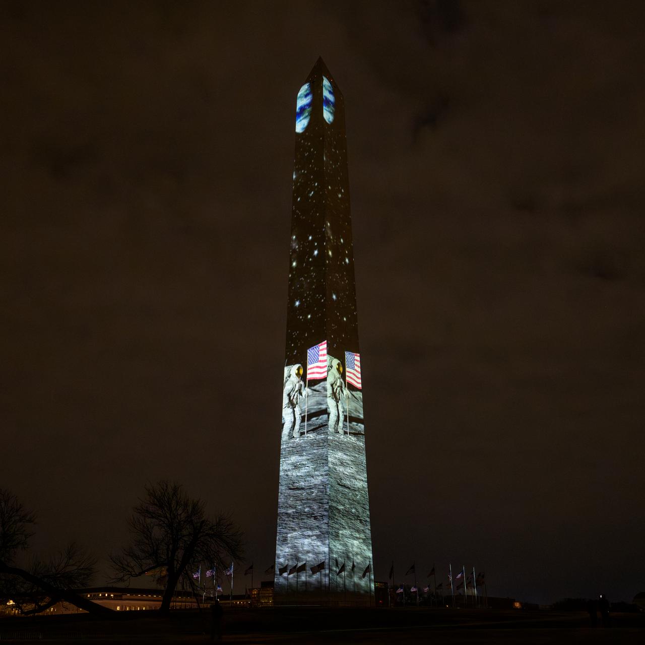 Images depicting NASA Apollo Moon missions are projected onto Washington Monument as part of an event to kick off the nation's 250th birthday year, Wednesday, Dec. 31, 2025, in Washington. Photo Credit: (NASA/Bill Ingalls)