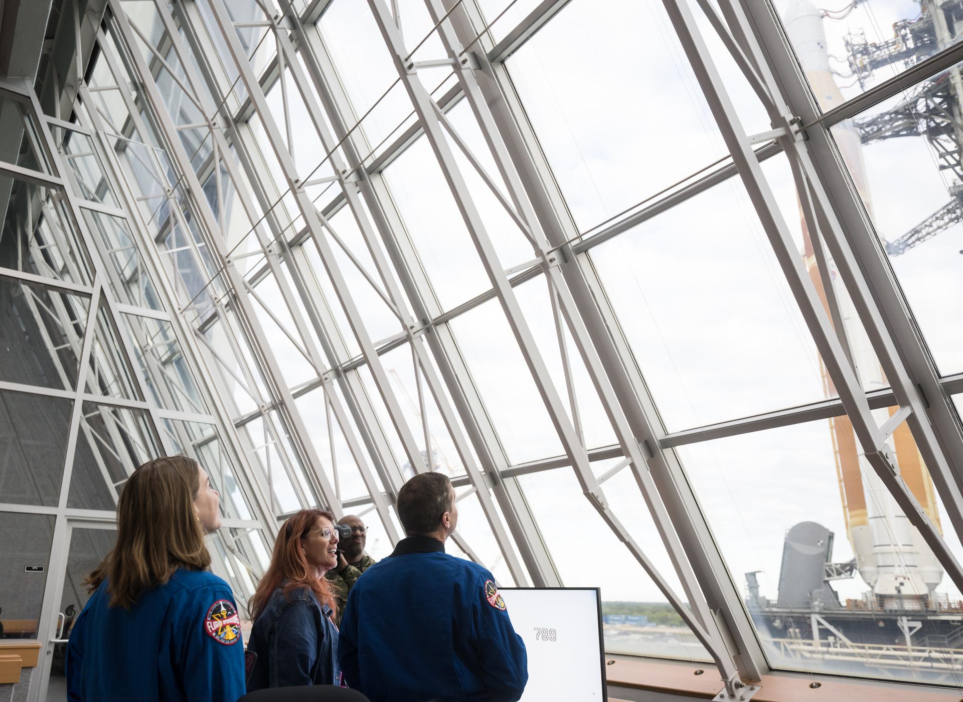 Charlie Blackwell-Thompson, Artemis II launch director at NASA's Kennedy Space Center speaks with NASA astronaut Reid Wiseman, Artemis II commander, right, while Artemis II backup crew member CSA (Canadian Space Agency) astronaut Jenni Gibbons looks on, left, in Firing Room One of the Rocco A. Petrone Launch Control Center as NASA’s Artemis II Space Launch System (SLS) rocket and Orion spacecraft, secured to the mobile launcher, roll out of High Bay 3 of the Vehicle Assembly Building to Launch Complex 39B, Saturday, Jan. 17, 2026, at NASA’s Kennedy Space Center in Florida. NASA’s Artemis II test flight will take Commander Reid Wiseman, Pilot Victor Glover, and Mission Specialist Christina Koch from NASA, and Mission Specialist Jeremy Hansen from the CSA (Canadian Space Agency), around the Moon and back to Earth no later than April 2026. Photo Credit: (NASA/Aubrey Gemignani)