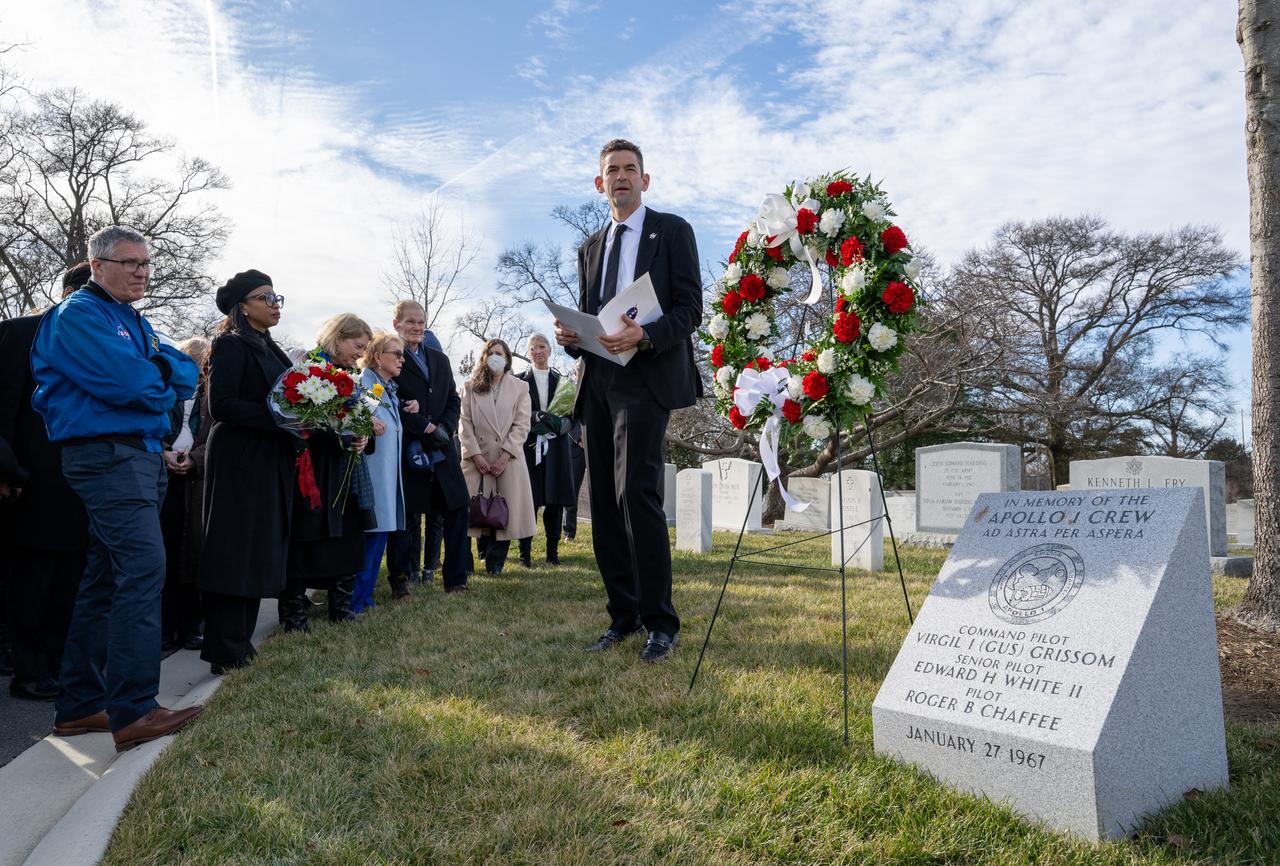 NASA Administrator Jared Isaacman delivers remarks after laying a wreath at the Apollo 1 Memorial during a ceremony that was part of NASA's Day of Remembrance, Thursday, Jan. 22, 2026, at Arlington National Cemetery in Arlington, Va. Wreaths were laid in memory of those men and women who lost their lives in the quest for space exploration. Photo Credit: (NASA/Keegan Barber)