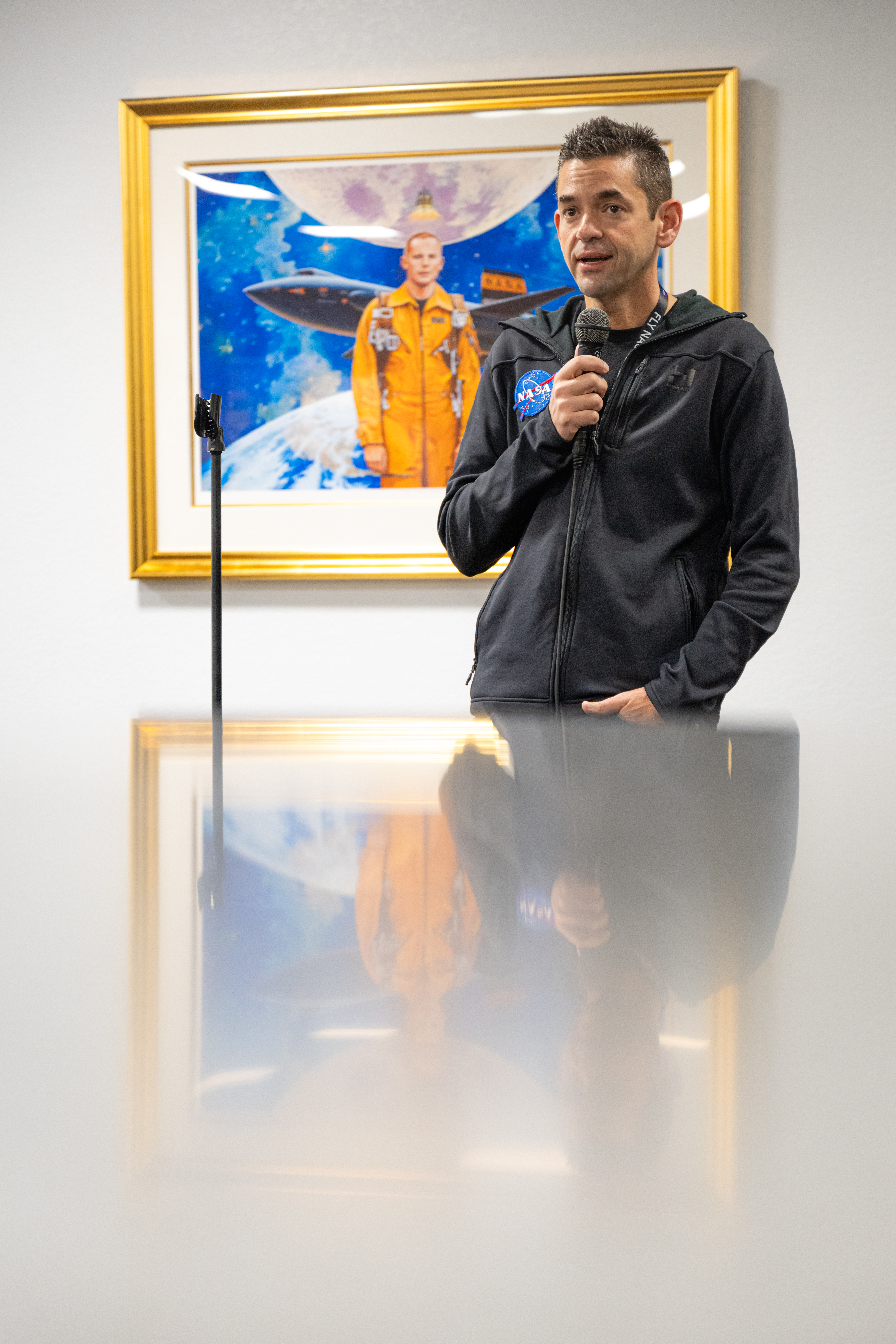 NASA Administrator Jared Isaacman speaks during a workforce Q&A session, Sunday, Jan. 25, 2026, at NASA’s Armstrong Flight Research Center at Edwards Air Force Base in California. Armstrong marks the ninth stop in Isaacman’s roadshow to visit NASA facilities and engage directly with the agency’s workforce. Photo Credit: (NASA/John Kraus)
