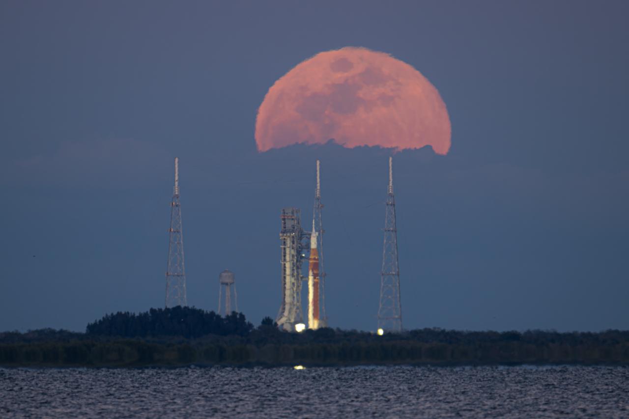 The full Moon rises behind NASA’s Artemis II Space Launch System (SLS) rocket and Orion spacecraft, standing atop a mobile launcher at Launch Complex 39B, Sunday, Feb. 1, 2026, at NASA’s Kennedy Space Center, as seen from Titusville, Fla. NASA’s Artemis II test flight will take Commander Reid Wiseman, Pilot Victor Glover, and Mission Specialist Christina Koch from NASA, and Mission Specialist Jeremy Hansen from the CSA (Canadian Space Agency), around the Moon and back to Earth no later than April 2026. Photo Credit: (NASA/John Kraus)