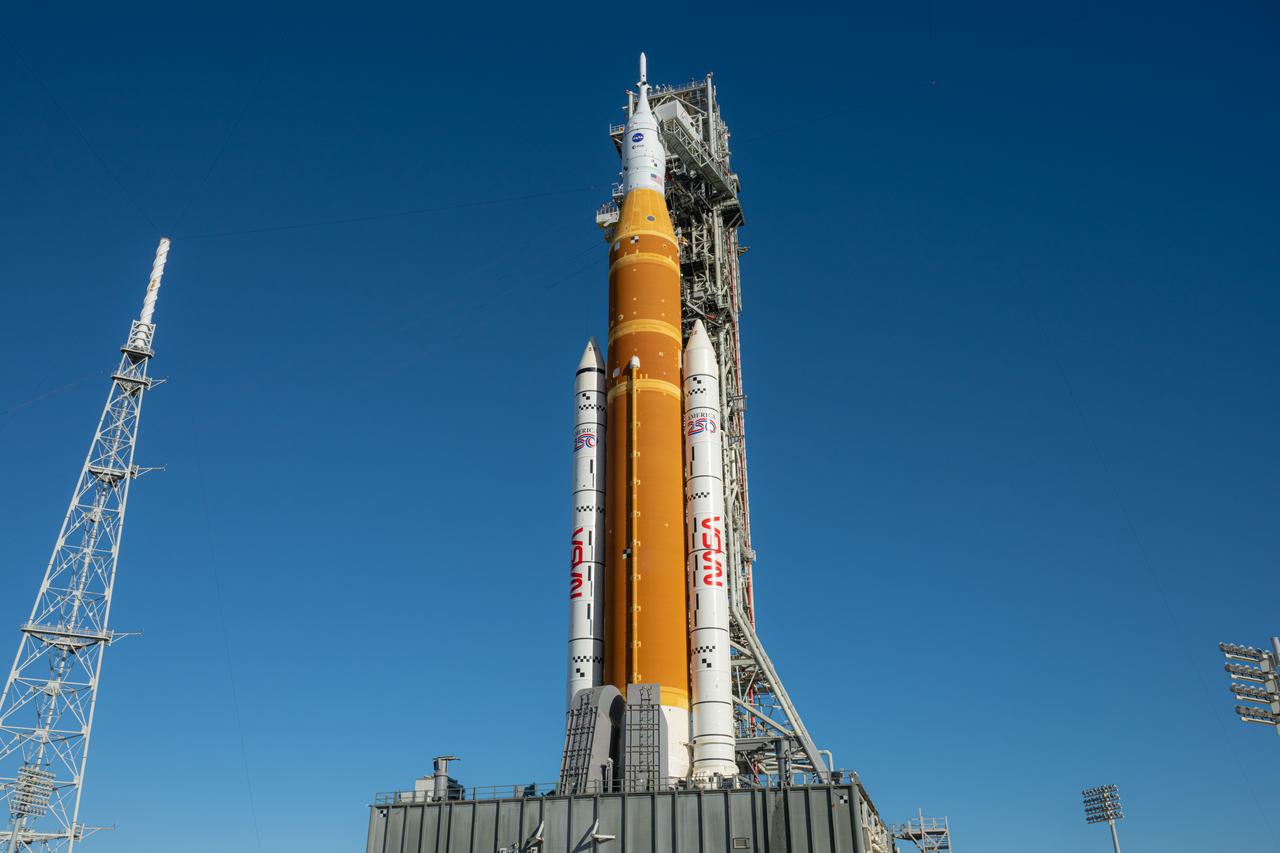 NASA’s Artemis II Space Launch System (SLS) rocket and Orion spacecraft are seen standing atop a mobile launcher at Launch Complex 39B, Monday, Feb. 2, 2026, at NASA’s Kennedy Space Center in Florida. NASA’s Artemis II test flight will take Commander Reid Wiseman, Pilot Victor Glover, and Mission Specialist Christina Koch from NASA, and Mission Specialist Jeremy Hansen from the CSA (Canadian Space Agency), around the Moon and back to Earth no later than April 2026. Photo Credit: (NASA/John Kraus)