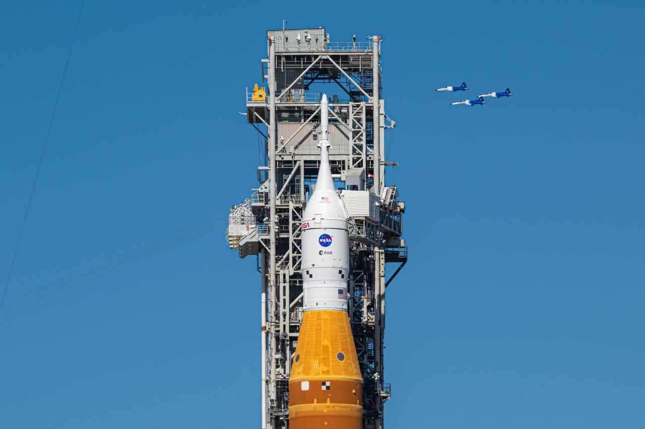 NASA Administrator Jared Isaacman conducts a formation flight with three of his personal F-5 aircraft, Sunday, Feb. 8, 2026, at NASA’s Kennedy Space Center in Florida. The formation flew near the Artemis II SLS (Space Launch System) rocket and Orion spacecraft at Launch Complex 39B and the surrounding area at Kennedy. Photo Credit: (NASA/John Kraus)