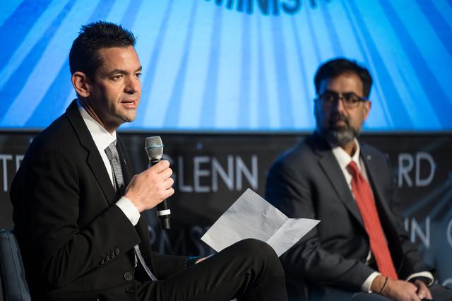 NASA Administrator Jared Isaacman, left, and NASA Associate Administrator Amit Kshatriya, speak with the agency workforce during a monthly coffee and donuts with the Administrator event, Tuesday, Feb. 24, 2026, at the Mary W. Jackson NASA Headquarters building in Washington. Photo Credit: (NASA/Aubrey Gemignani)