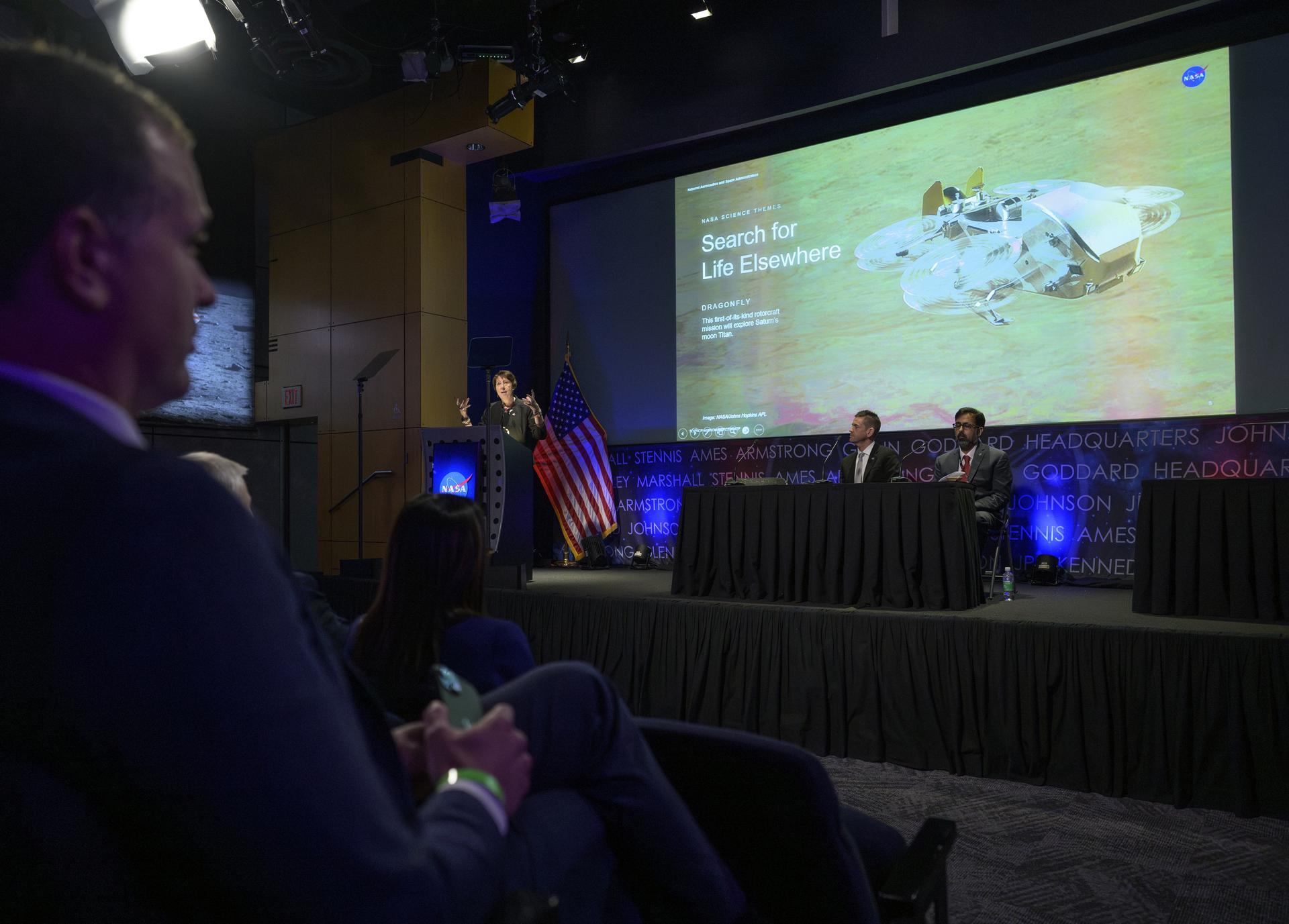 Associate Administrator for NASA's Science Mission Directorate Nicola Fox speaks, as NASA Administrator Jared Isaacman, and NASA Associate Administrator Amit Kshatriya, right, look on, during an event where NASA is outlining how the agency is executing President Donald J. Trump’s National Space Policy and accelerating preparations for America’s return to the surface of the Moon by 2028, Tuesday, March 24, 2026, at the Mary W. Jackson NASA Headquarters building in Washington. During the event NASA leadership provided updates on mission priorities, including sending the first astronauts to the lunar surface in more than 50 years, establishing the initial elements of a permanent lunar base, getting America underway in space on nuclear propulsion, and other objectives. Photo Credit: (NASA/Bill Ingalls)