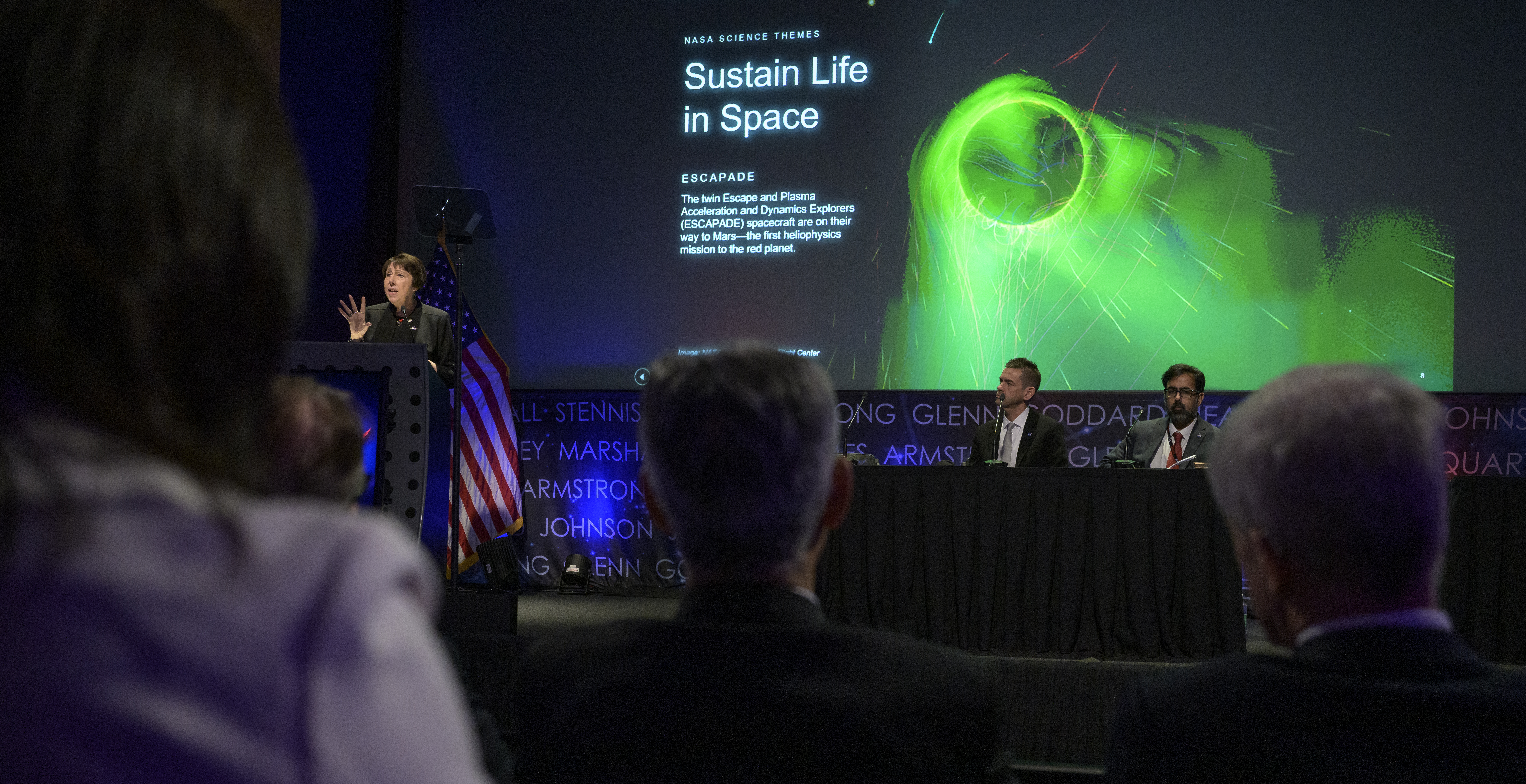 Associate Administrator for NASA's Science Mission Directorate Nicola Fox speaks, as NASA Administrator Jared Isaacman, and NASA Associate Administrator Amit Kshatriya, right, look on, during an event where NASA is outlining how the agency is executing President Donald J. Trump’s National Space Policy and accelerating preparations for America’s return to the surface of the Moon by 2028, Tuesday, March 24, 2026, at the Mary W. Jackson NASA Headquarters building in Washington. During the event NASA leadership provided updates on mission priorities, including sending the first astronauts to the lunar surface in more than 50 years, establishing the initial elements of a permanent lunar base, getting America underway in space on nuclear propulsion, and other objectives. Photo Credit: (NASA/Bill Ingalls)