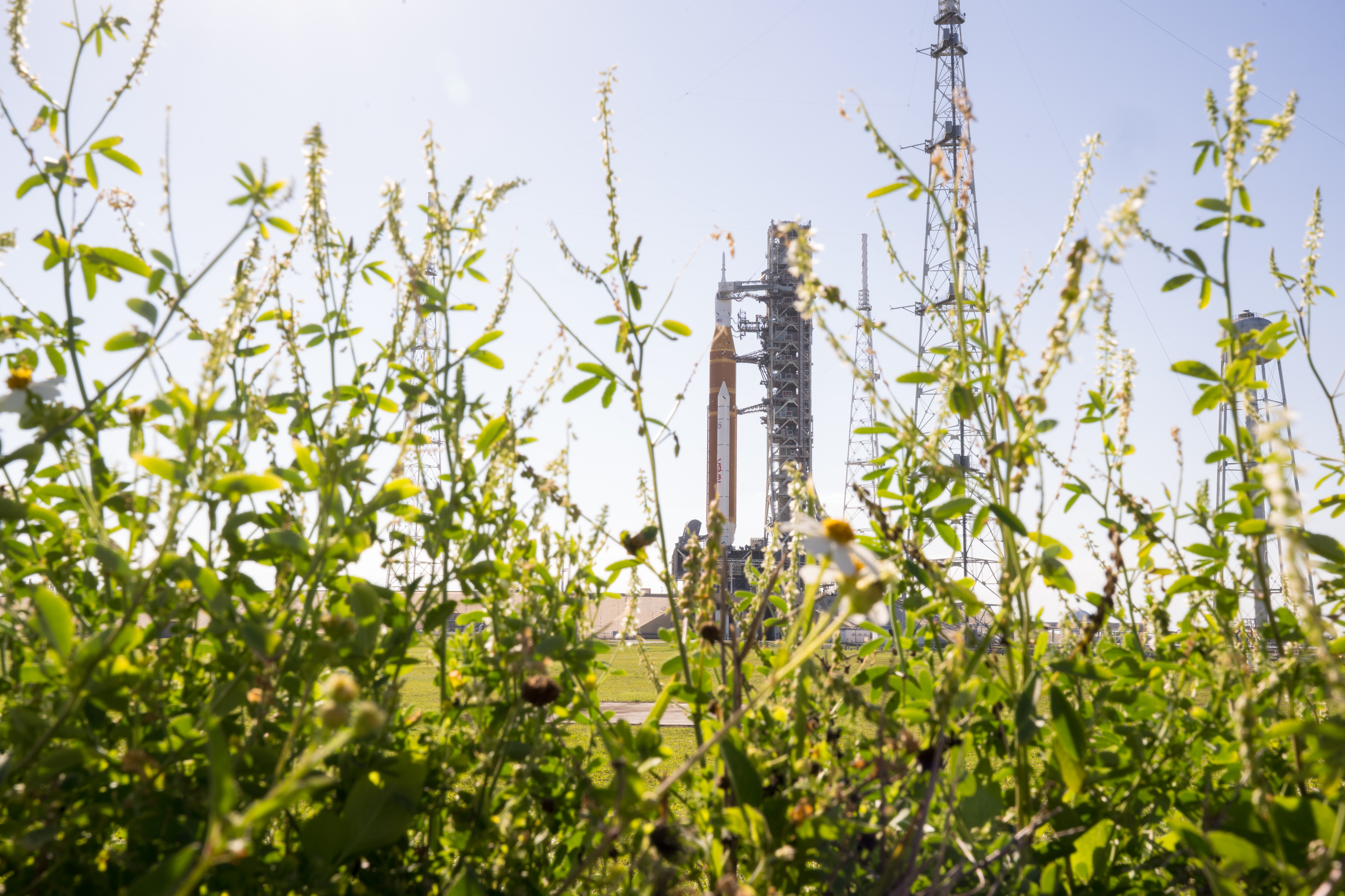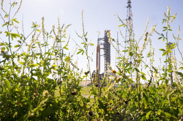 NASA’s Artemis II Space Launch System (SLS) rocket and Orion spacecraft are seen at Launch Complex 39B, Friday, March 27, 2026, at NASA’s Kennedy Space Center in Florida. The Artemis II test flight will take Commander Reid Wiseman, Pilot Victor Glover, and Mission Specialist Christina Koch from NASA, and Mission Specialist Jeremy Hansen from the CSA (Canadian Space Agency), around the Moon and back to Earth with launch opportunities beginning in April 2026. Photo Credit: (NASA/Aubrey Gemignani)