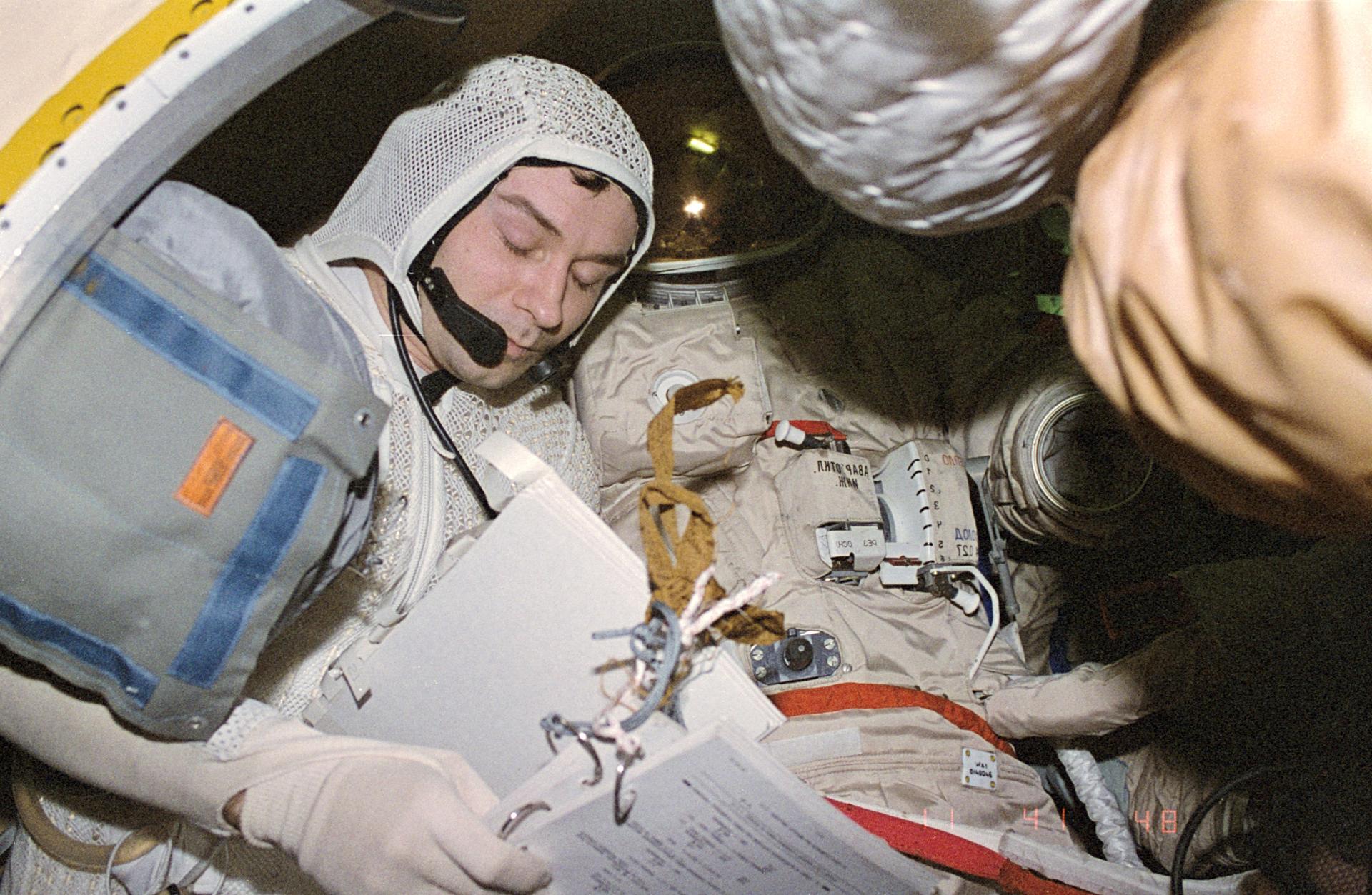 NM18-304-012 (March-July 1995) --- Cosmonaut Vladimir N. Dezhurov, Mir-18 mission commander, is seen in his thermal undergarment prior to donning an EVA suit for one of five space walks conducted during his 115 days aboard Mir. This visual was one of many that the three Mir-18 crew emembers showed at a July 18 press conference in Houston.