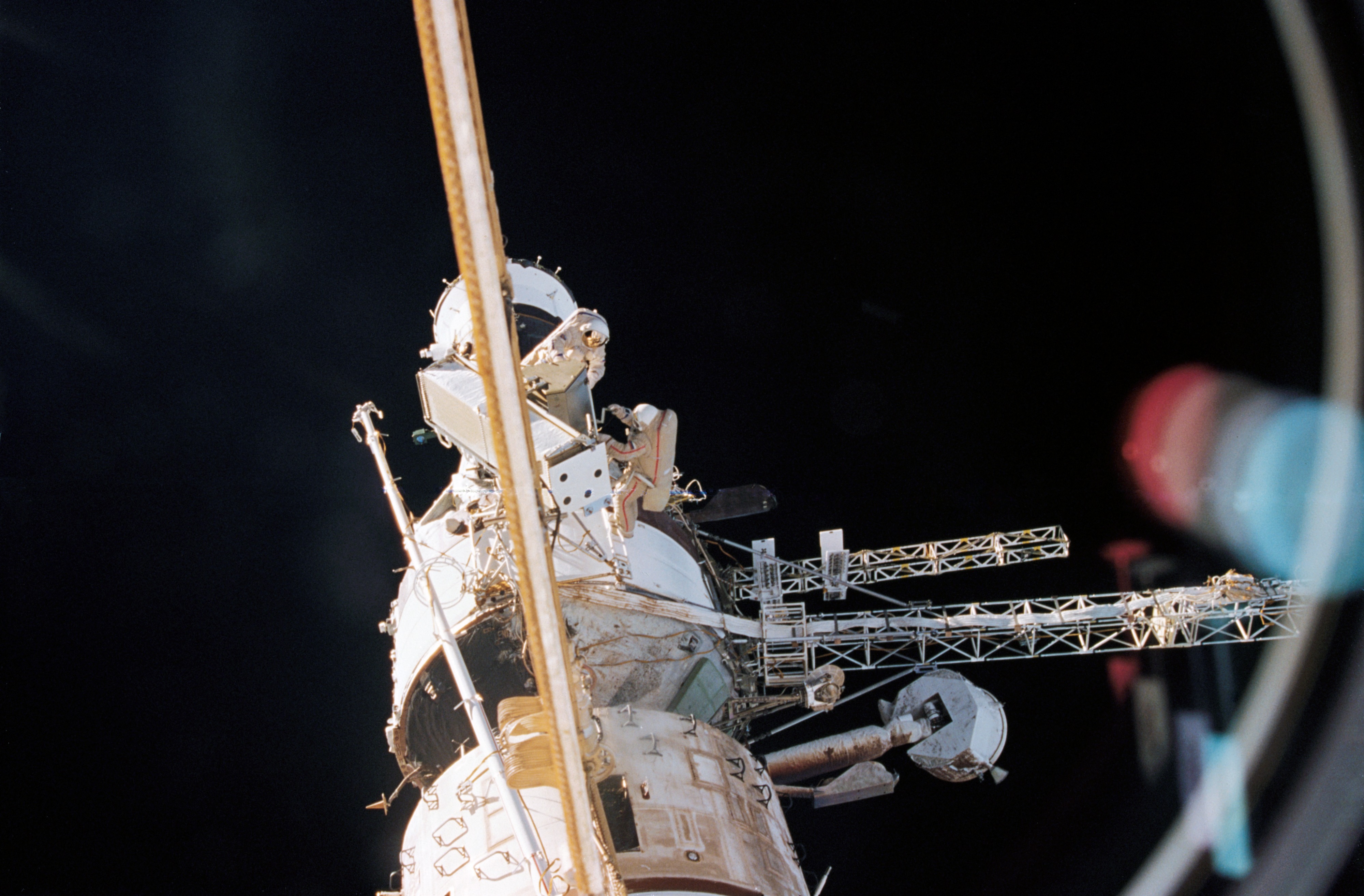 NM21-393-009 (For release October 1996) --- Cosmonauts Yuriy I. Onufriyenko (wearing red stripe on suit) and Yuriy V. Usachov were photographed by astronaut and cosmonaut guest researcher Shannon W. Lucid as the pair performed a scheduled Extravehicular Activity (EVA) in the early days of Lucid’s extended stay aboard Russia’s Mir Space Station.