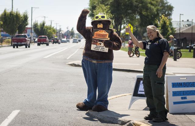 Smokey Bear, left, and Judy Reese of the Crooked River National Grassland, right, wave at passersby as crowds arrive to watch the total solar eclipse in Madras, Oregon on Saturday, August 19, 2017. The eclipse will be sweeping across a narrow portion of the contiguous United States from Lincoln Beach, Oregon to Charleston, South Carolina on August 21. A partial solar eclipse will be visible across the entire North American continent along with parts of South America, Africa, and Europe. Photo Credit: (NASA/Aubrey Gemignani)