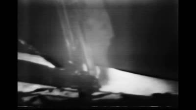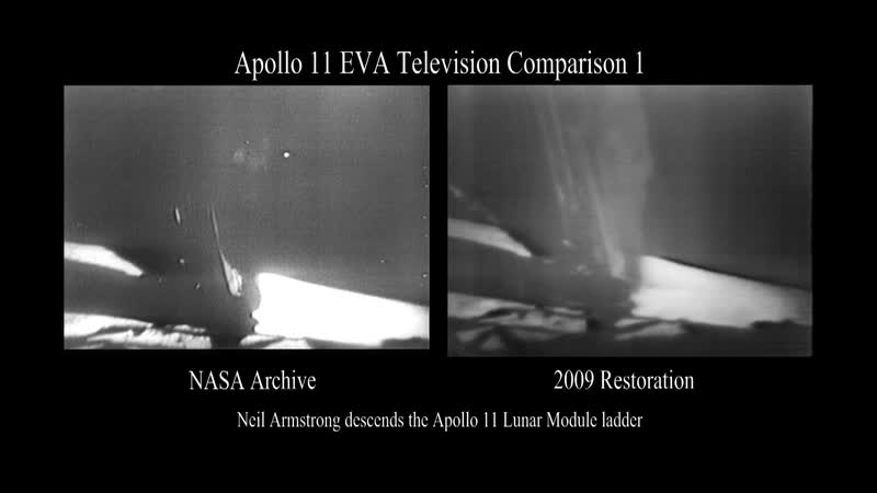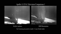 This video shows Neil Armstrong climbing down the lunar module ladder to the lunar surface. The video compares existing footage with the partially restored video. The thumbnail image shows the new footage on the left and the old on the right.