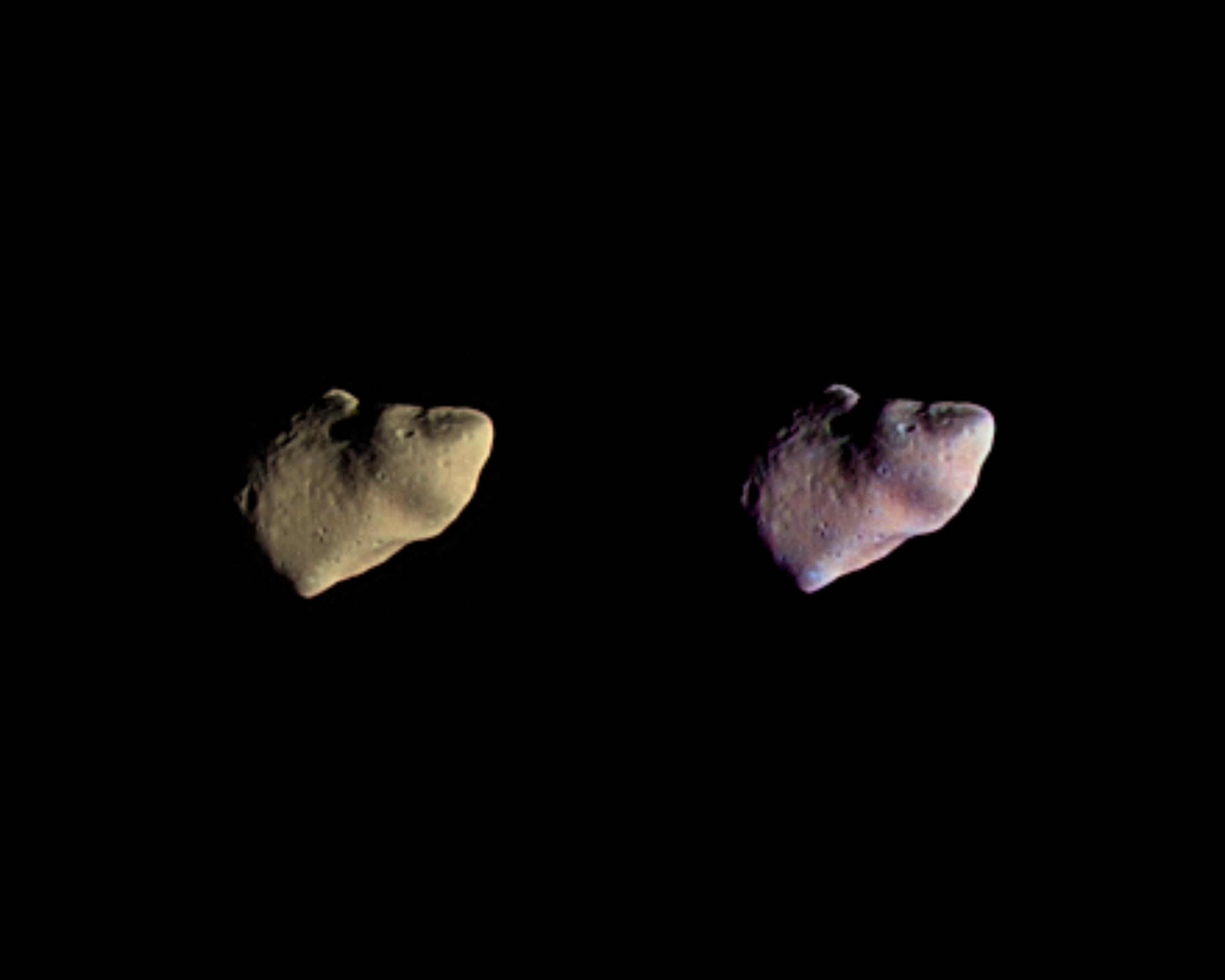 These two color views of the asteroid Gaspra were produced by combining three images taken through violet, green, and infrared filters by NASA's Galileo spacecraft on October 29, 1991. http://photojournal.jpl.nasa.gov/catalog/PIA00125