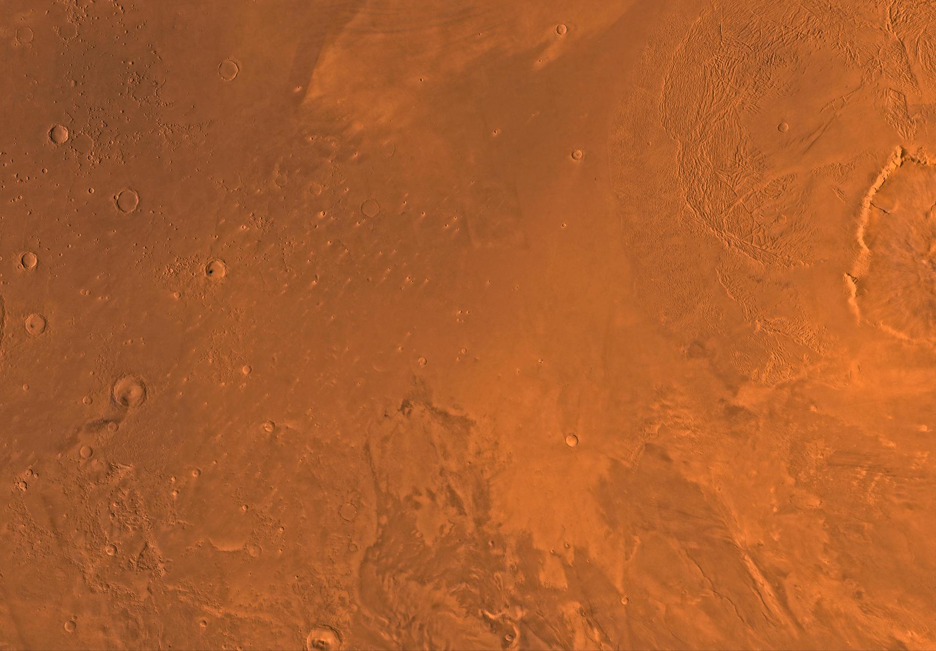 Mars digital-image mosaic merged with color of the MC-8 quadrangle, Amazonis region of Mars. This image is from NASA's Viking Orbiter 1. http://photojournal.jpl.nasa.gov/catalog/PIA00168