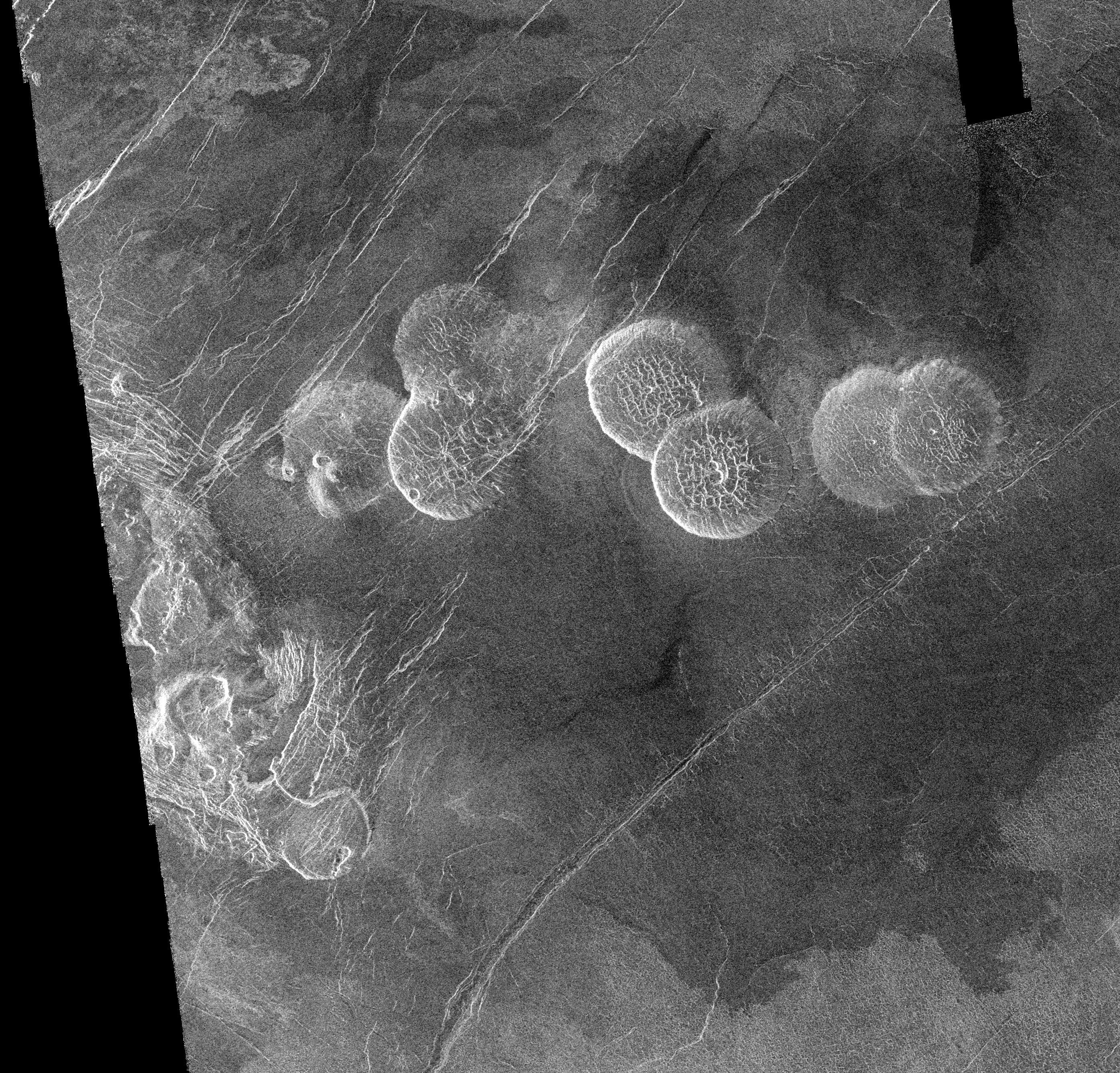 The eastern edge of Alpha Regio is shown in this image from NASA Magellan spacecraft. http://photojournal.jpl.nasa.gov/catalog/PIA00215
