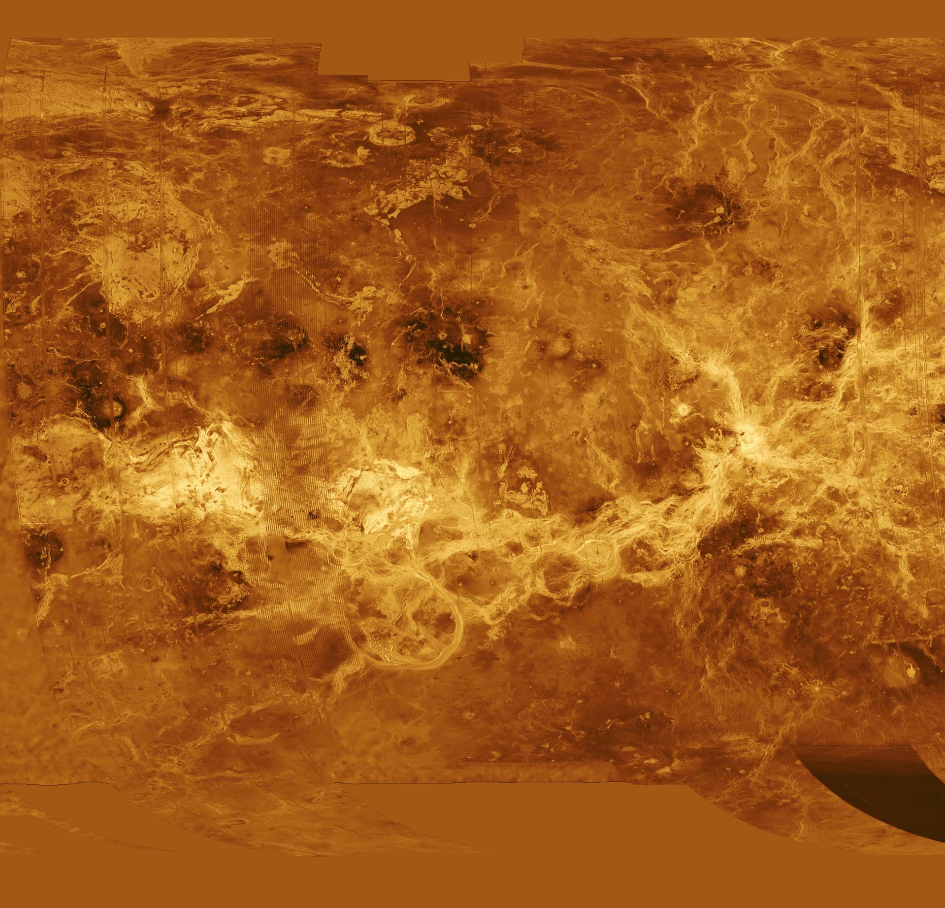 The eastern half of the planet is displayed in this simple cylindrical map of the surface of Venus obtained by NASA Magellan spacecraft. http://photojournal.jpl.nasa.gov/catalog/PIA00256