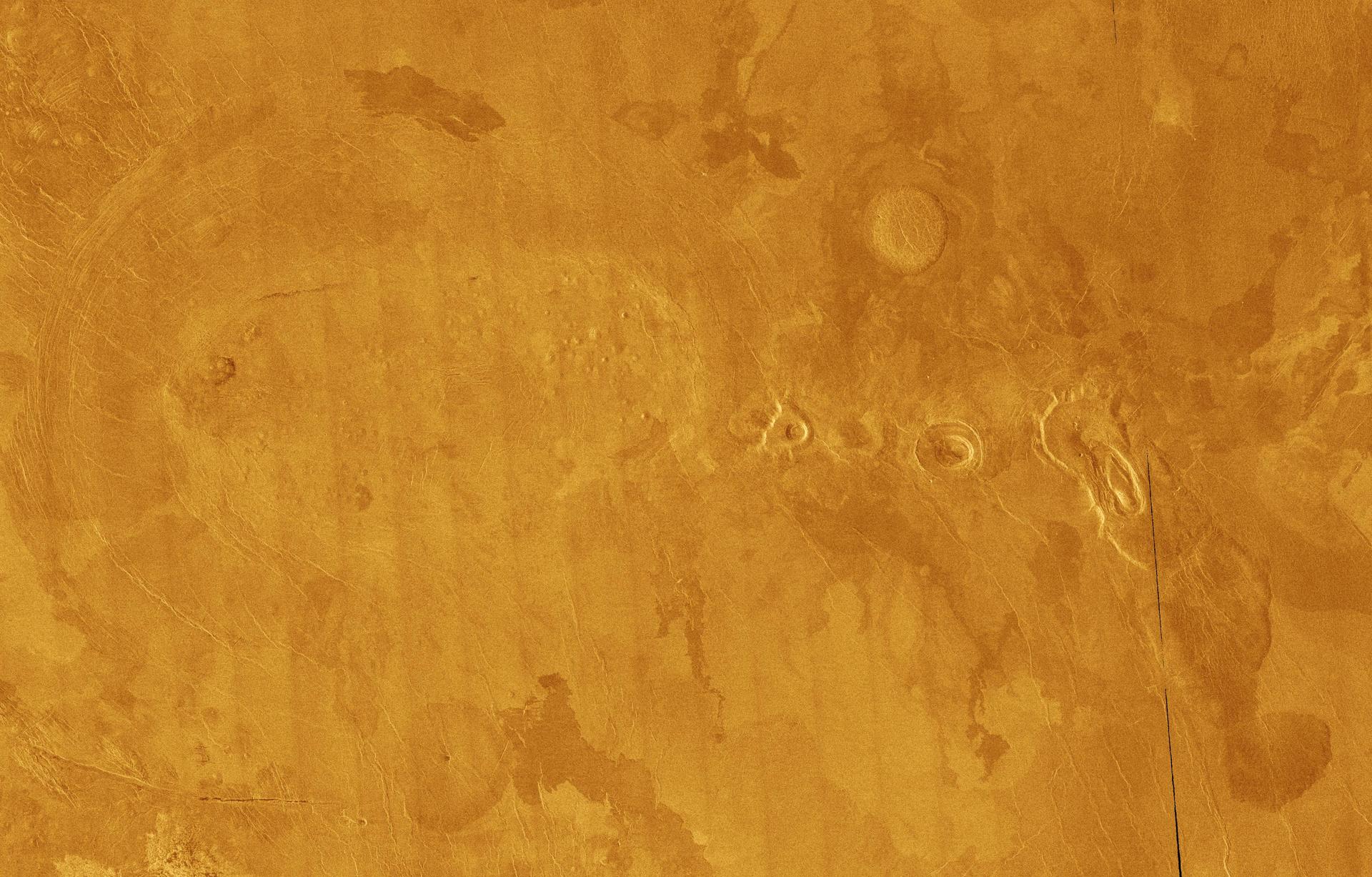 This full-resolution mosaic of Venus, obtained by NASA Magellan spacecraft, shows an area replete with diverse volcanic features. http://photojournal.jpl.nasa.gov/catalog/PIA00265