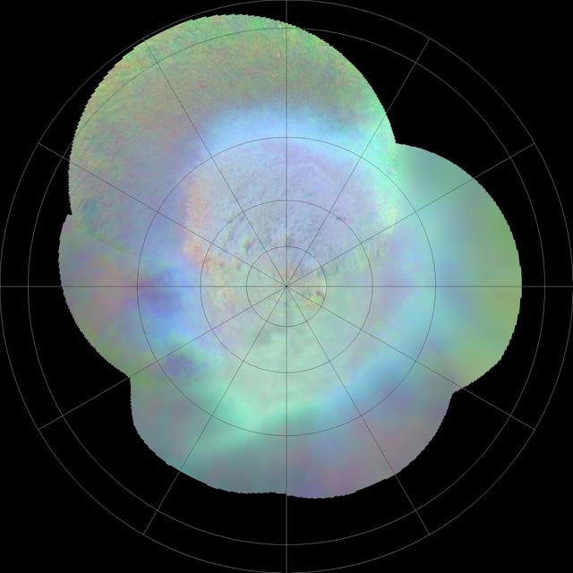 This polar projection from NASA Voyager 2 of Triton southern hemisphere provides a view of the southern polar cap and bright equatorial fringe. The margin of the cap is scalloped and ranges in latitude from +10 degrees to -30 degrees. The bright fringe is closely associated with the cap's margin; from it, diffuse bright rays extend north-northeast for hundreds of kilometers. The bright fringe probably consists of very fresh nitrogen frost or snow, and the rays consist of bright-fringe materials that were redistributed by north-moving Coriolis-deflected winds. http://photojournal.jpl.nasa.gov/catalog/PIA00423