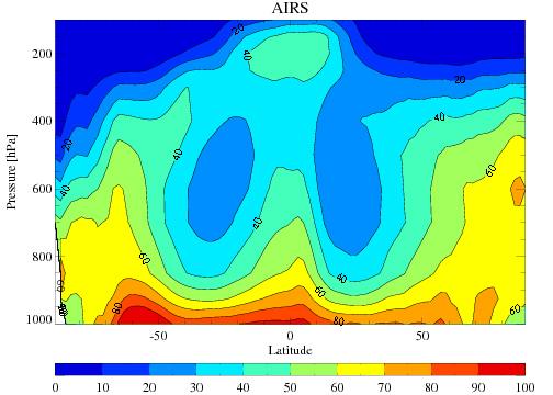 The average tropospheric relative humidity from the Atmospheric Infrared Sounder AIRS onboard NASA Aqua satellite for the four December-February periods during 2002 through 2005.