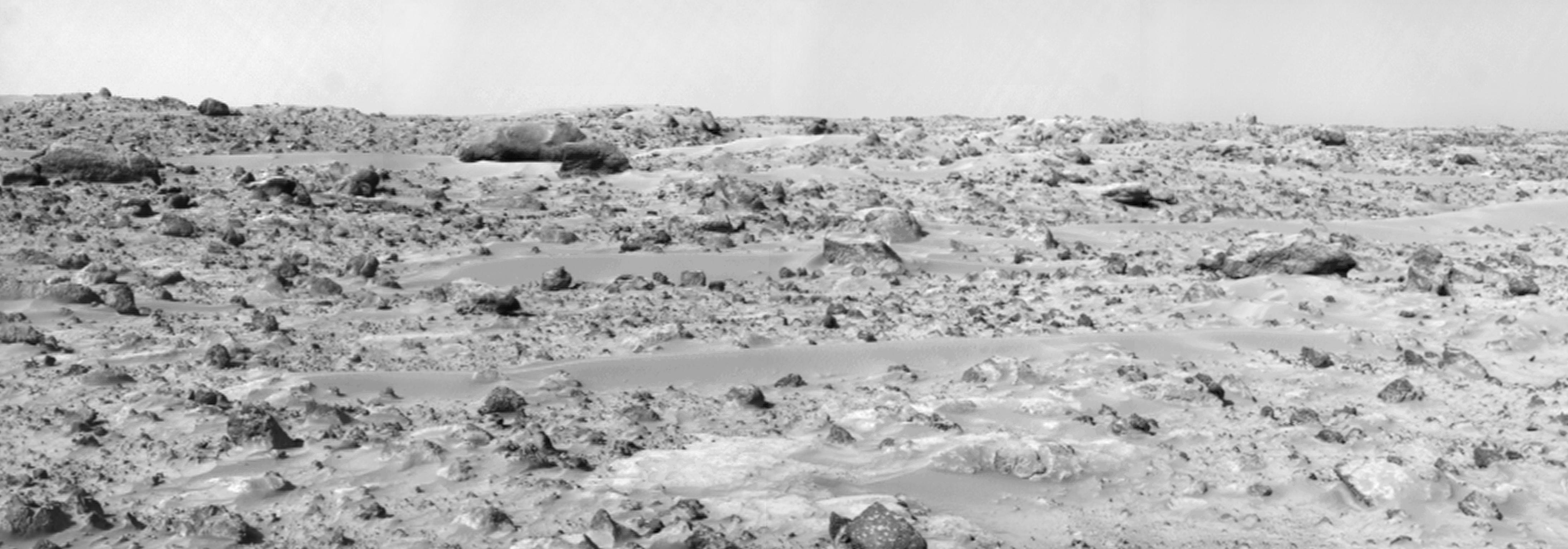 This panorama of the region to the northeast of the lander was constructed to support the Sojourner Rover Team's plans to conduct an "autonomous traverse" to explore the terrain away from the lander after science objectives in the lander vicinity had been met. The large, relatively bright surface in the foreground, about 10 meters (33 feet) from the spacecraft, in this scene is "Baker's Bench." The large, elongated rock left of center in the middle distance is "Zaphod." This view was produced by combining 8 individual "Superpan" scenes from the left and right eyes of the IMP camera. Each frame consists of 8 individual frames (left eye) and 7 frames (right eye) taken with different color filters that were enlarged by 500% and then co-added using Adobe Photoshop to produce, in effect, a super-resolution panchromatic frame that is sharper than an individual frame would be. http://photojournal.jpl.nasa.gov/catalog/PIA01000