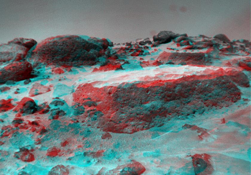 This anaglyph view of Flat Top, due south of the lander, was produced by NASA Mars Pathfinder Imager camera. 3D glasses are necessary to identify surface detail.