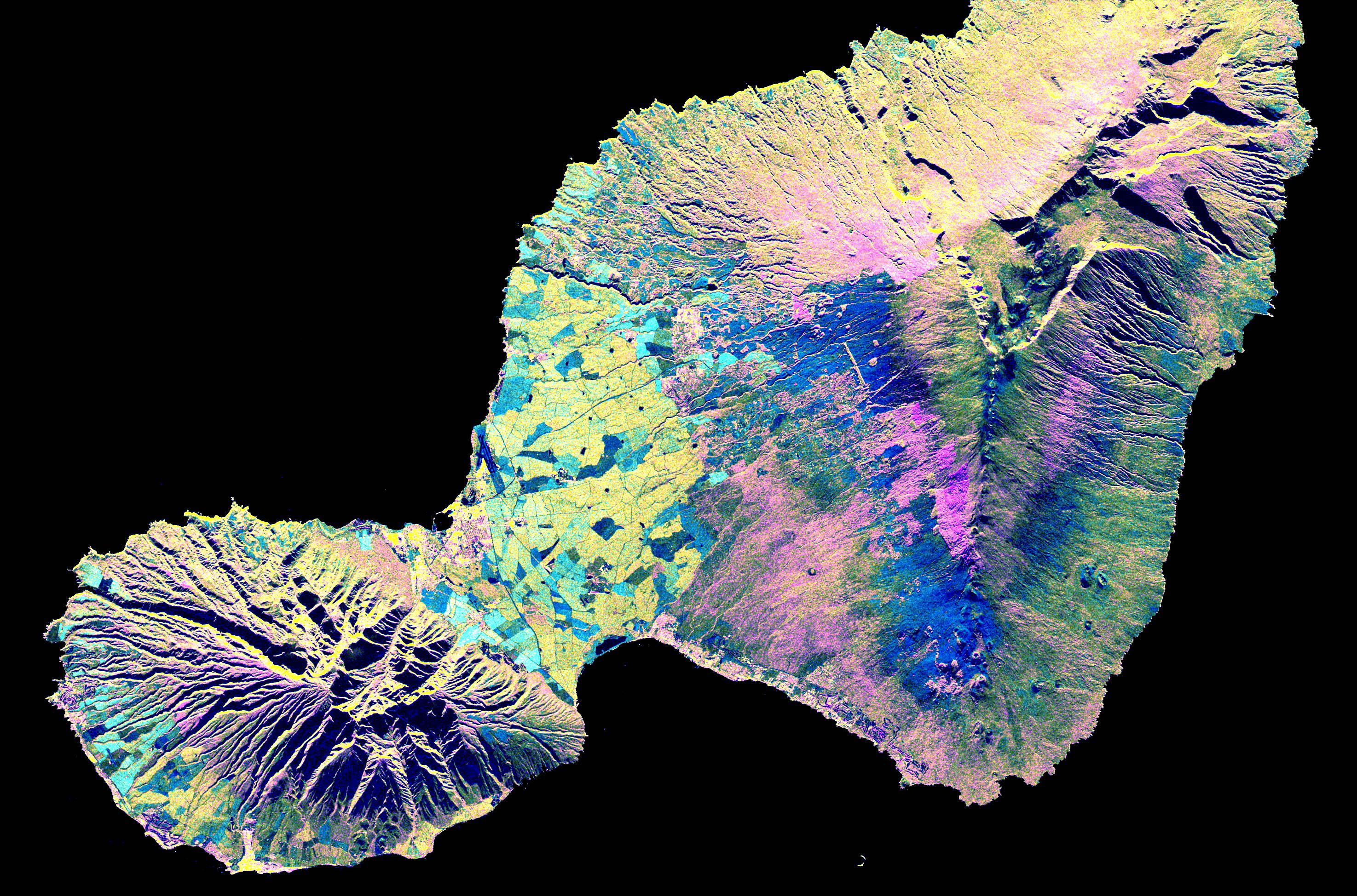 This spaceborne radar image shows the Valley Island of Maui, Hawaii. The cloud-penetrating capabilities of radar provide a rare view of many parts of the island, since the higher elevations are frequently shrouded in clouds.