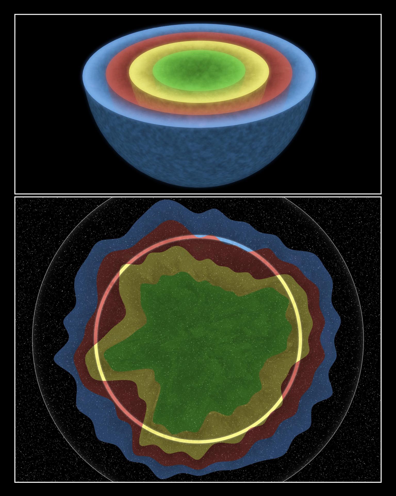 This artist concept shows that NASA Spitzer Space Telescope found evidence that this star, the remains of which are named Cassiopeia A, exploded with some degree of order, preserving chunks of its onion-like layers as it blasted apart.