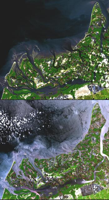 In many parts of the world, wetlands are being converted to shrimp ponds in order to farm these crustaceans for food and sale. One example is on the west coast of Ecuador, south of Guayaquil. This image was acquired by NASA Terra spacecraft.