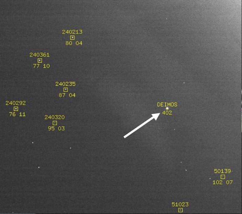 This image showing the position of the Martian moon Deimos against a background of stars is part of a successful technology demonstration completed by NASA Mars Reconnaissance Orbiter before arrival at Mars