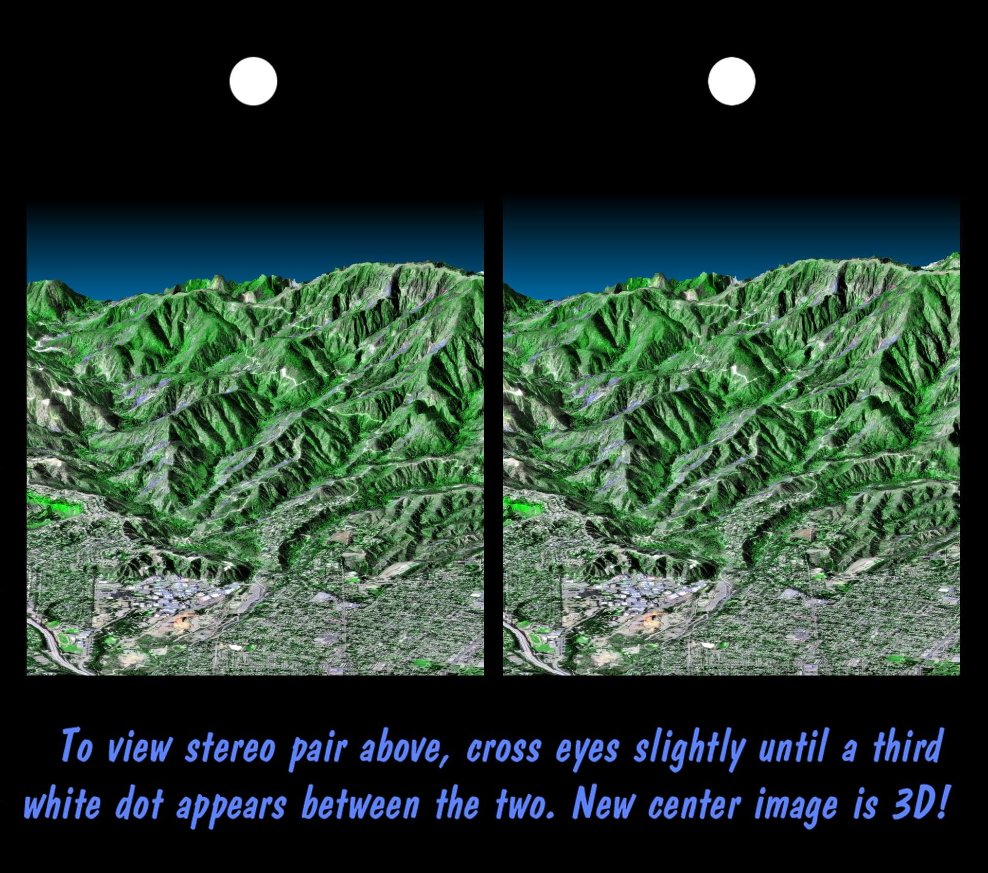 This stereoscopic image pair is a perspective view that shows the western part of the city of Pasadena, California, looking north toward the San Gabriel Mountains. Portions of the cities of Altadena and La Canada Flintridge are also shown.
