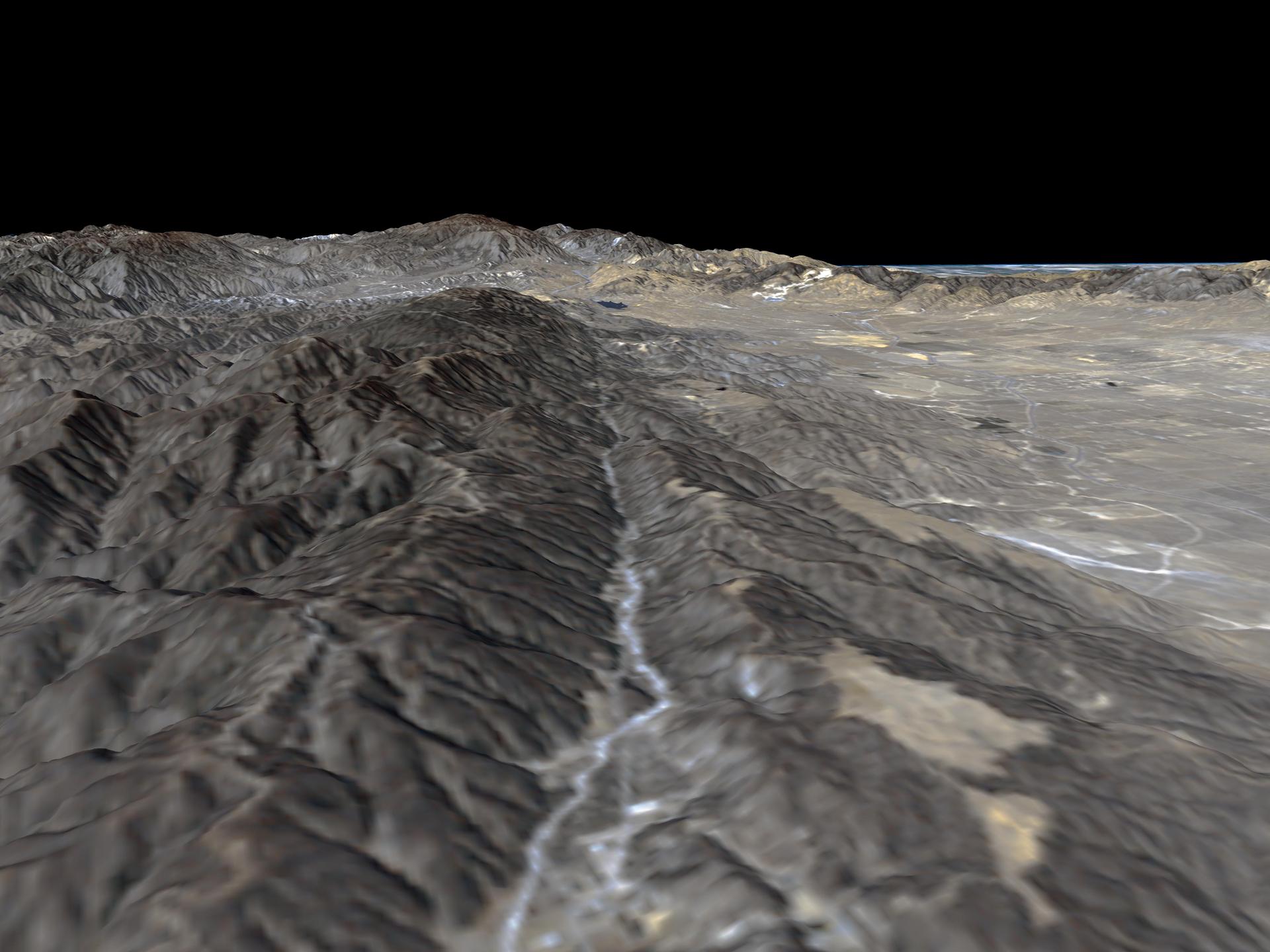 The prominent linear feature straight down the center of this perspective view is California famous San Andreas Fault. The image was created with data from NASA Shuttle Radar Topography Mission SRTM.