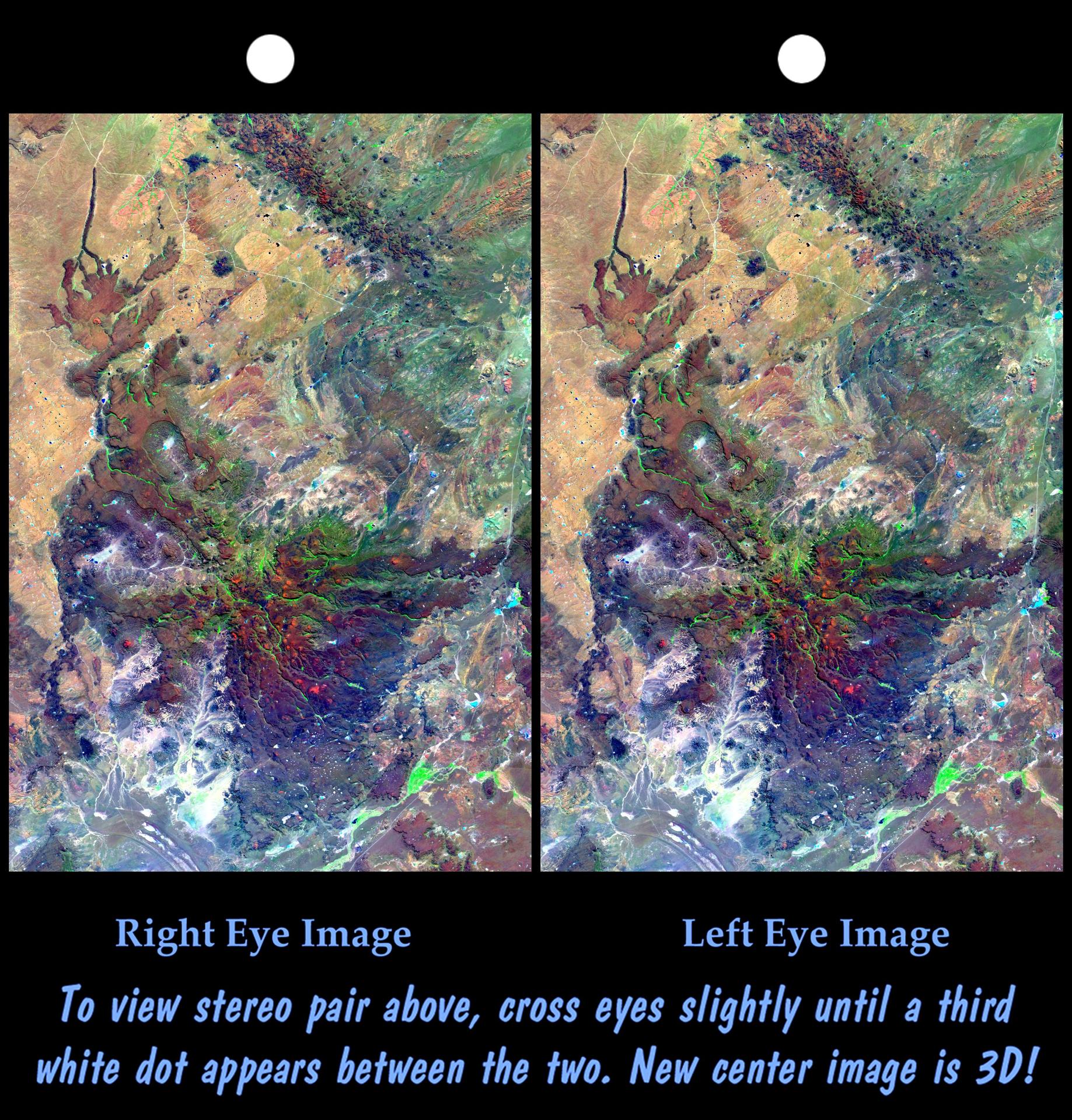This view of northern Patagonia, at Los Menucos, Argentina shows remnants of relatively young volcanoes built upon an eroded plain of much older and contorted volcanic, granitic, and sedimentary rocks.