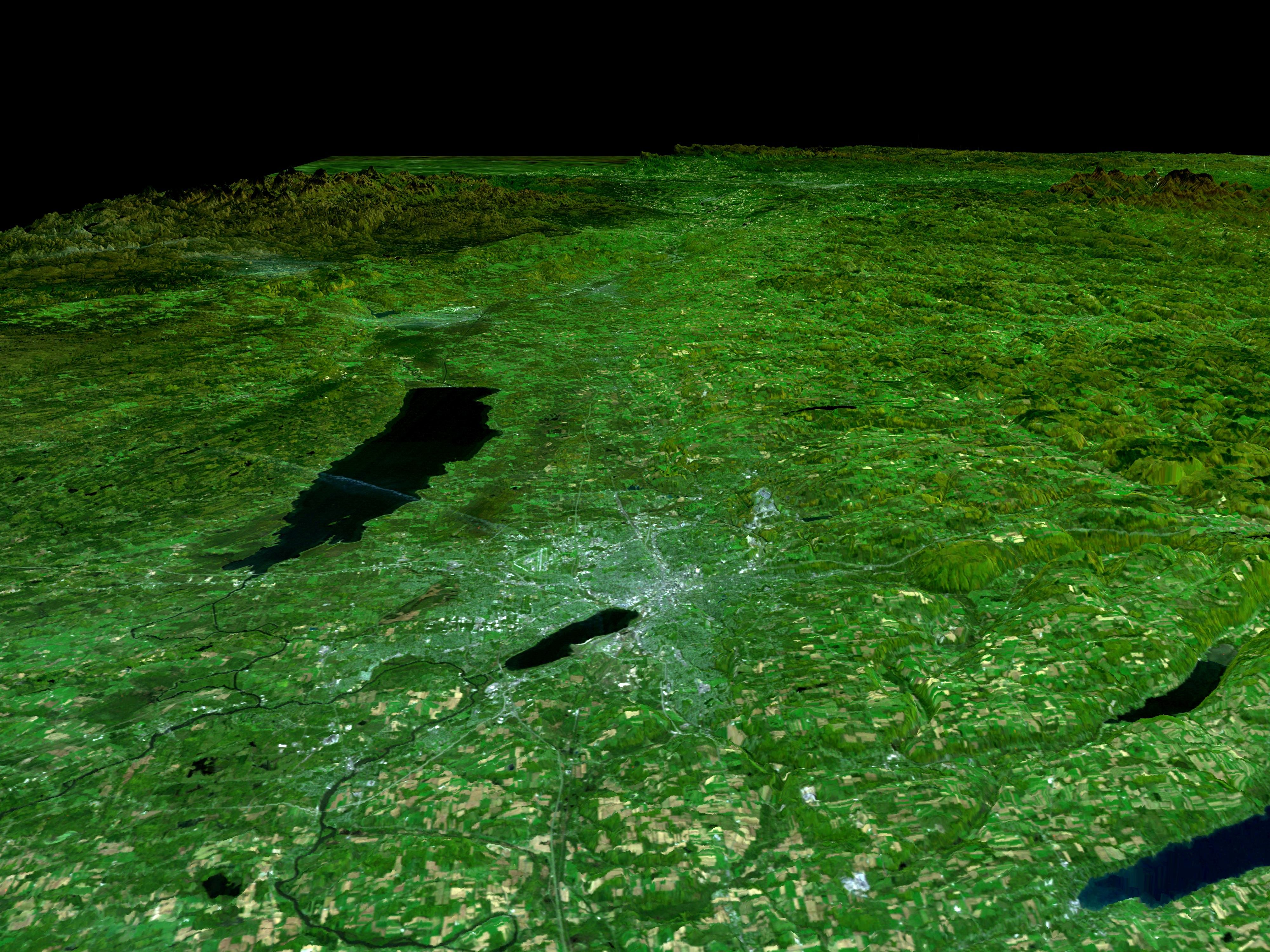In the lower center of this perspective view of upstate New York, the city of Syracuse hugs the southeastern banks top right side of Lake Onondaga, the smaller of the two dark features that dominate the scene.