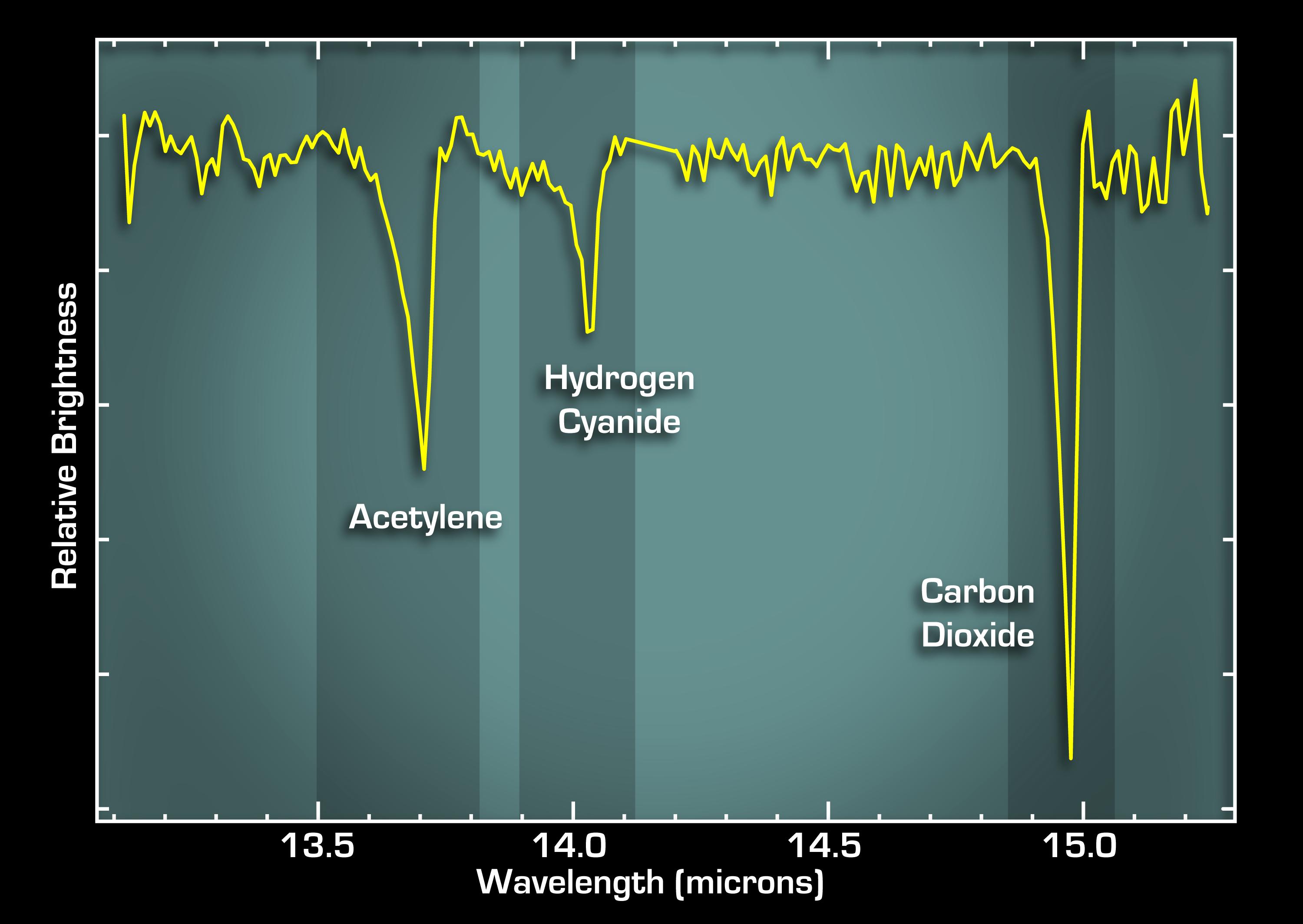 This graph, or spectrum, from NASA Spitzer Space Telescope tells astronomers that some of the most basic ingredients of DNA and protein are concentrated in a dusty planet-forming disk circling a young sun-like star called IRS 46.