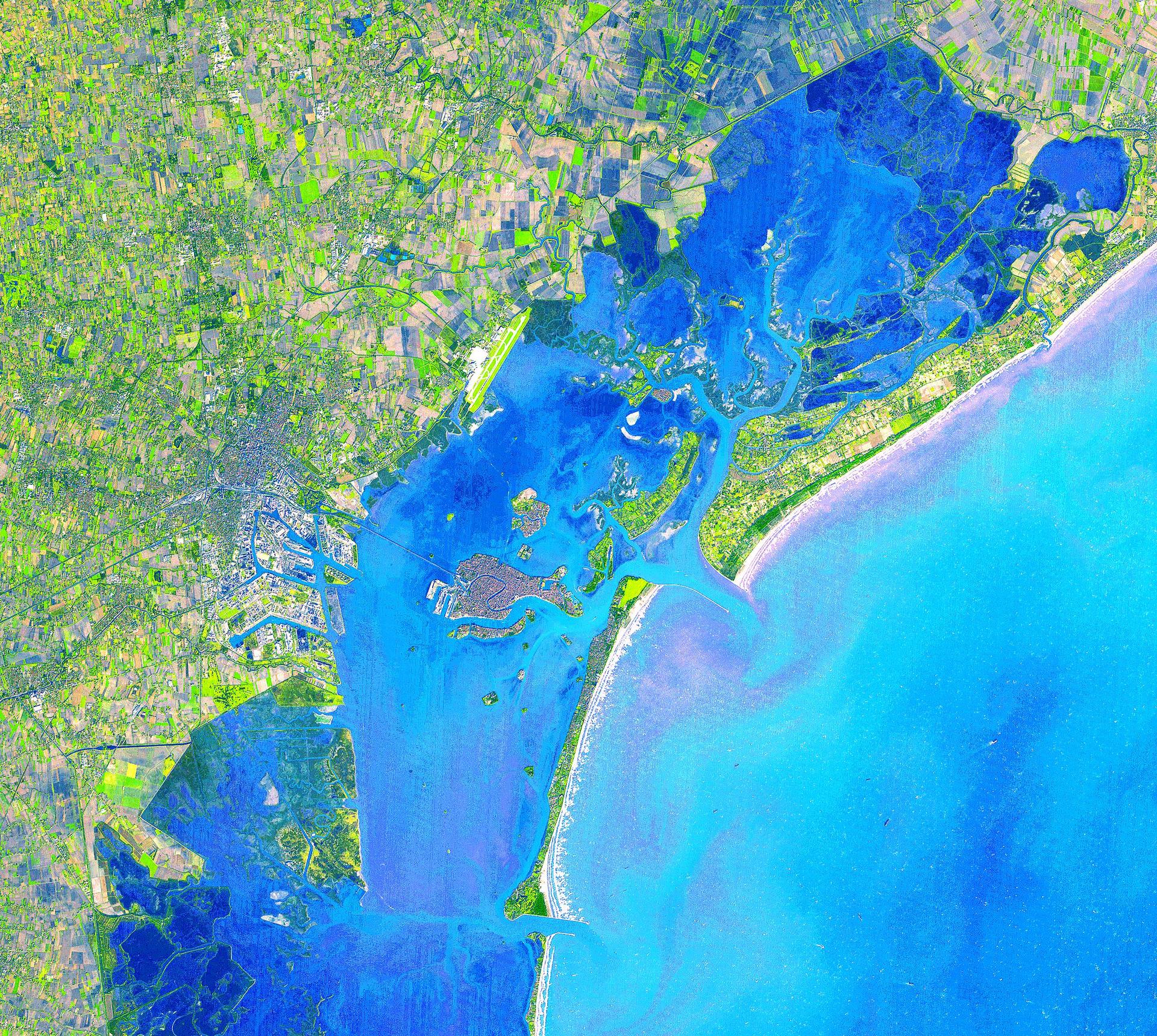 Four hundred bridges cross the labyrinth of canals that form the 120 islands of Venice, situated in a saltwater lagoon between the mouths of the Po and Piave rivers in northeast Italy. All traffic in the city moves by boat. Venice is connected to the mainland, 4 kilometers (2.5 miles) away, by ferries as well as a causeway for road and rail traffic. The Grand Canal winds through the city for about 3 kilometers (about 2 miles), dividing it into two nearly equal sections. According to tradition, Venice was founded in 452, when the inhabitants of Aquileia, Padua, and several other northern Italian cities took refuge on the islands of the lagoon from the Teutonic tribes invading Italy at that time. This image was acquired on December 9, 2001 by the Advanced Spaceborne Thermal Emission and Reflection Radiometer (ASTER) on NASA's Terra satellite. With its 14 spectral bands from the visible to the thermal infrared wavelength region, and its high spatial resolution of 15 to 90 meters (about 50 to 300 feet), ASTER will image Earth for the next 6 years to map and monitor the changing surface of our planet. http://photojournal.jpl.nasa.gov/catalog/PIA03860