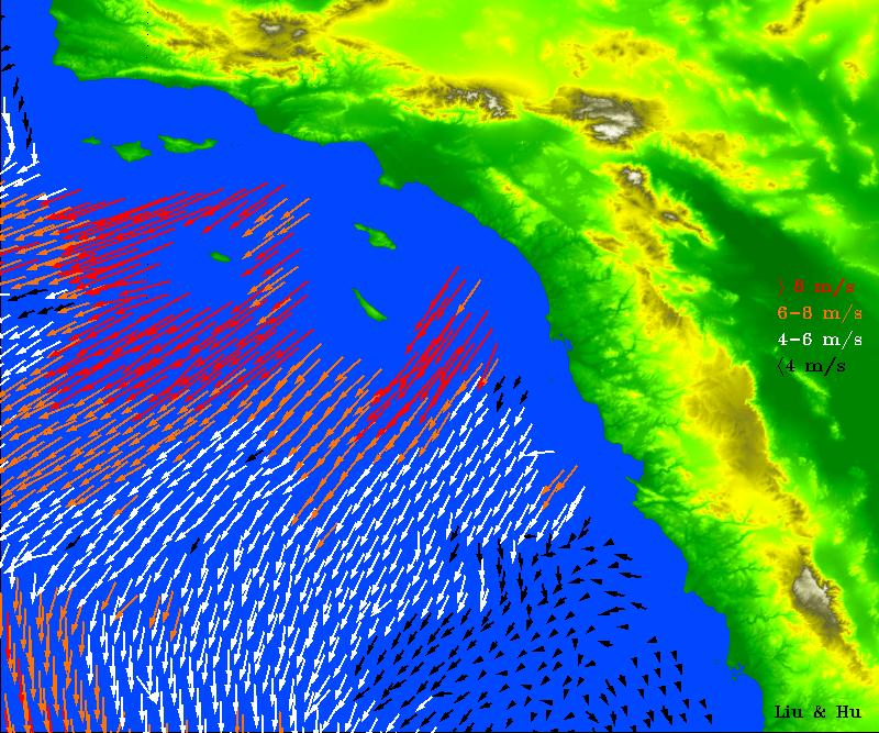 High-resolution ocean surface wind data from NASA's Quick Scatterometer (QuikScat) illustrate the strength of Santa Ana winds that pounded Southern California this week, causing damage and spreading brush fires. The colored arrows represent various ranges of wind speed, which were still well in excess of 30 knots (34 miles per hour), even after reaching the ocean and weakening. Santa Ana winds are offshore and down-slope winds unique to Southern California that are usually channeled through mountain gaps. These Santa Ana winds extend more than 500 kilometers (310 miles) offshore before changing direction to flow along the shore. The wind speeds and directions are retrieved from range-compressed backscatter data measured by QuikScat that has much higher spatial resolution than QuikScat's standard data products. Useful applications of high-resolution science-quality wind products derived from range-compressed backscatter have been demonstrated in two scientific papers: one on Hurricane Floyd and the other on Catalina Eddies. This is the first demonstration on near-real-time retrieval applications. http://photojournal.jpl.nasa.gov/catalog/PIA03892